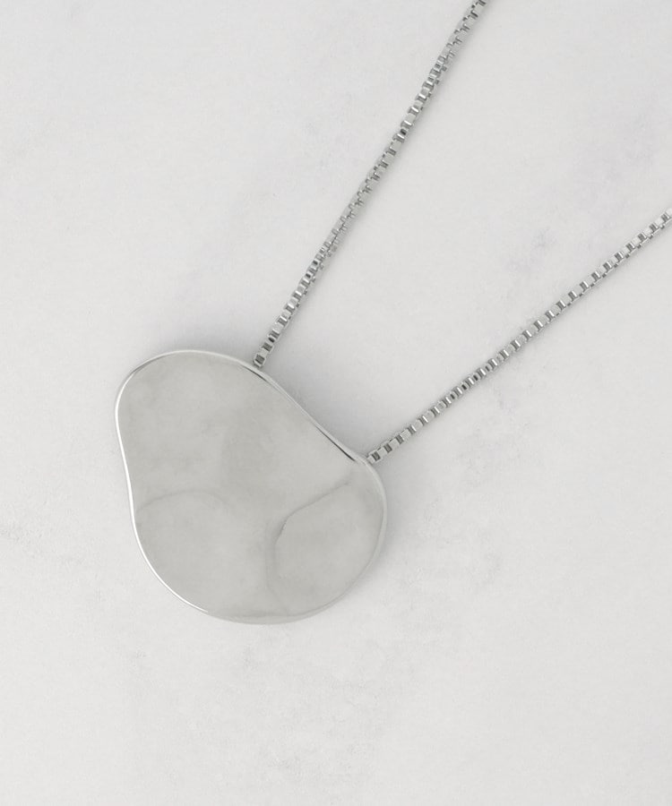 【デザイン】ニュアンス感のあるプレートが印象的なロングネックレス。有機的なフォルムのメタルプレートが光を受けて水面のようにきらめきます。シンプルなニットやブラウスに合わせやすい、気負わないのに目を惹く、そんな大人のための「ちょうどいい存在感」をもったネックレスです。※照明の関係により、実際よりも色味が違って見える場合があります。また、パソコン・スマートフォンなどの環境により、若干製品と画像のカラーが異なる場合もございます。