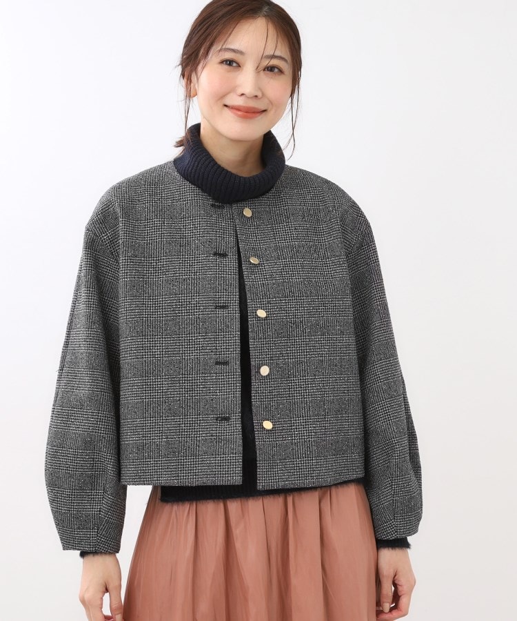 【デザイン】クラシカルなグレンチェック柄とふんわりとしたスリーブが特徴のショート丈ジャコット。ドロップショルダーでアームホールにゆとりを持たせているので、ボリュームのあるインナーの上からも羽織っていただけます◎。袖口はダーツを三方面につくり、ふっくらと立体的な形が出るようにしています。【素材】ポリエステルをベースにレーヨンリング糸にてツイード調に仕上げ、クラシカルなグレンチェック柄を表現した素材です。【仕様】・ポケット数:横×2・裏地:総裏仕立て※照明の関係により、実際よりも色味が違って見える場合があります。また、パソコン・スマートフォンなどの環境により、若干製品と画像のカラーが異なる場合もございます。