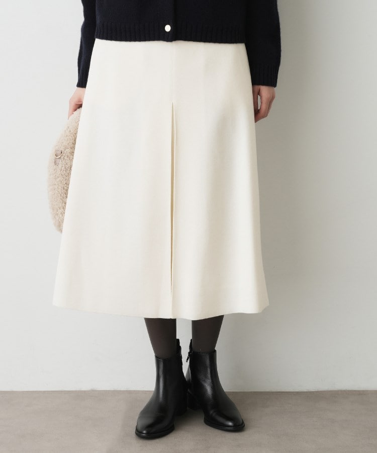 【デザインポイント】ウエストベルトの釦とボックスタックのデザインがクラシカルで上品な印象のフレアスカート。後ろウエストはゴム仕様なのでリラックスした履き心地です。ブーツと相性の良い丈に拘りました。【スタイリングポイント】きれいめなニットとブーツをあわせたスタイリングがおすすめです。【素材ポイント】柔らかく適度な張りのあるメルトン素材です。ジャージー素材なのでやや伸縮性があります。【仕様】・ポケット数:横×2・ウエスト後ろゴム・裏地あり※ホワイト(002)はやや透け感があります。※照明の関係により、実際よりも色味が違って見える場合があります。また、パソコン・スマートフォンなどの環境により、若干製品と画像のカラーが異なる場合もございます。