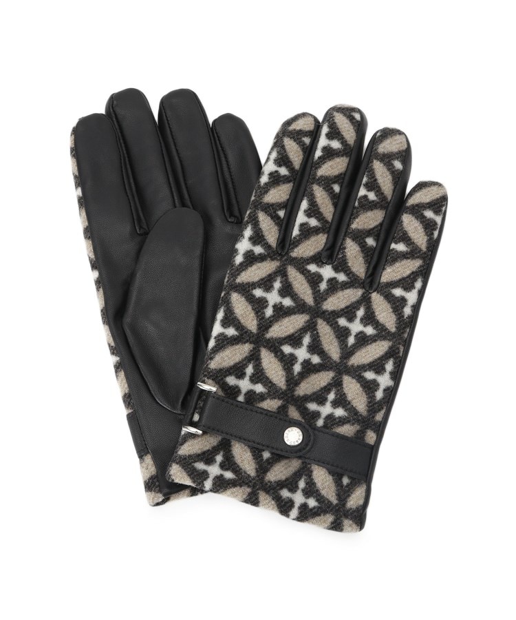 《存在感あるオーバーラップサークル柄グローブ》リングを重ねたようなジオメトリック模様に、ドレステリアのイニシャルを組み合わせた「オーバーラップサークル」柄をあしらったデザイン性の高いグローブです。手のひら側には「スマートレザー」と呼ばれる革を使用しており、着けたままスマートフォンなどのタッチ操作が可能。デザインと機能性を兼ね備えた一品です。※機種により作動しない場合がございますので、予めご了承ください。※照明の関係により、実際よりも色味が違って見える場合があります。また、パソコン・スマートフォンなどの環境により、若干製品と画像のカラーが異なる場合もございます。