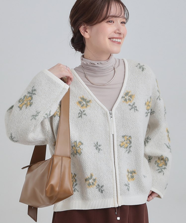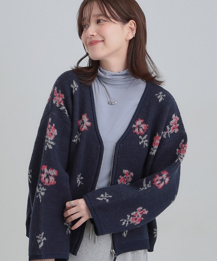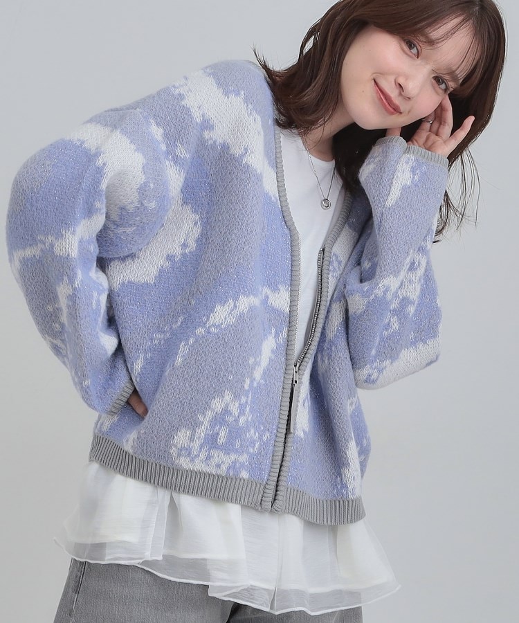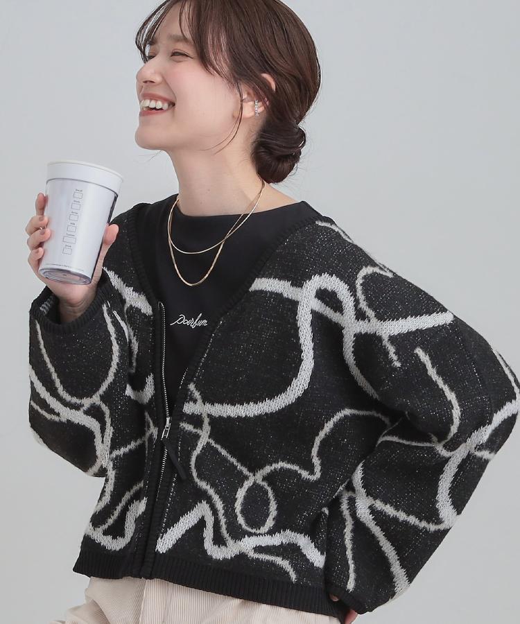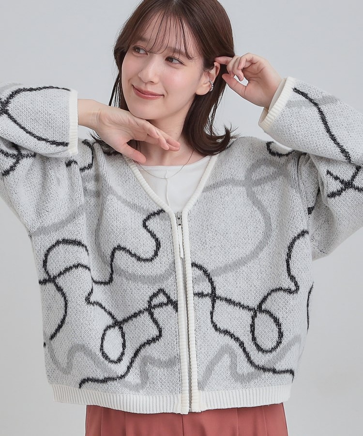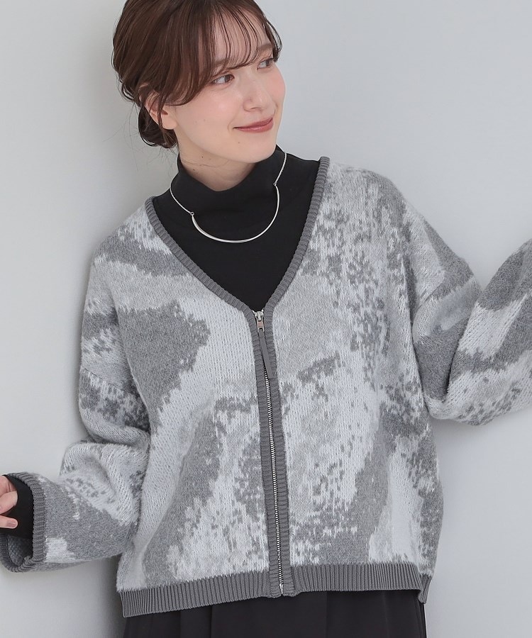【デザイン】ふわふわとしたモヘアライクの糸と、ショートフェザーの糸に、アクセントでラメを入れて柄を表現したジャカードニットカーディガン。フロントZIPできれいめにも使えるデザイン。人気のにょろにょろ柄と、モザイク調のニュアンス柄、花柄の3柄アソート。どんなボトムにも合わせやすい程よい丈です。金属ジップの引き手はグログランテープが付いている、ちょっとしたこだわりも。【スタイリング】ハイネックのインナーや、ロンTに合わせやすいVネックカーディガンです。デニムやフレアスカート、ワンピースなど幅広いアイテムに羽織りやすいデザインです。【素材】モヘアライク、ショートフェザー、ラメ、スポンディッシュと4種の糸を使用したジャカードニット。ふわふわとしたタッチと、程よく混ざったラメが特徴です。袖口、衿ぐり、裾はスポンディッシュの軽い糸を使用しています。※照明の関係により、実際よりも色味が違って見える場合があります。また、パソコン・スマートフォンなどの環境により、若干製品と画像のカラーが異なる場合もございます。#CutieBlonde#Cutie#cutieblonde#cutie#キューティブロンド#キューティ