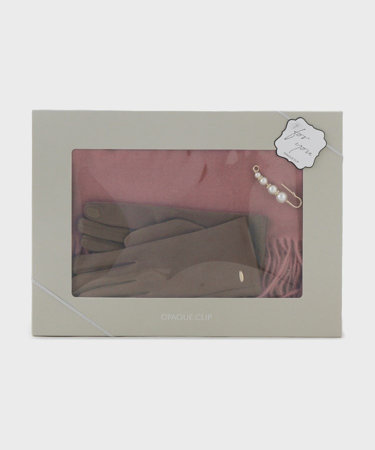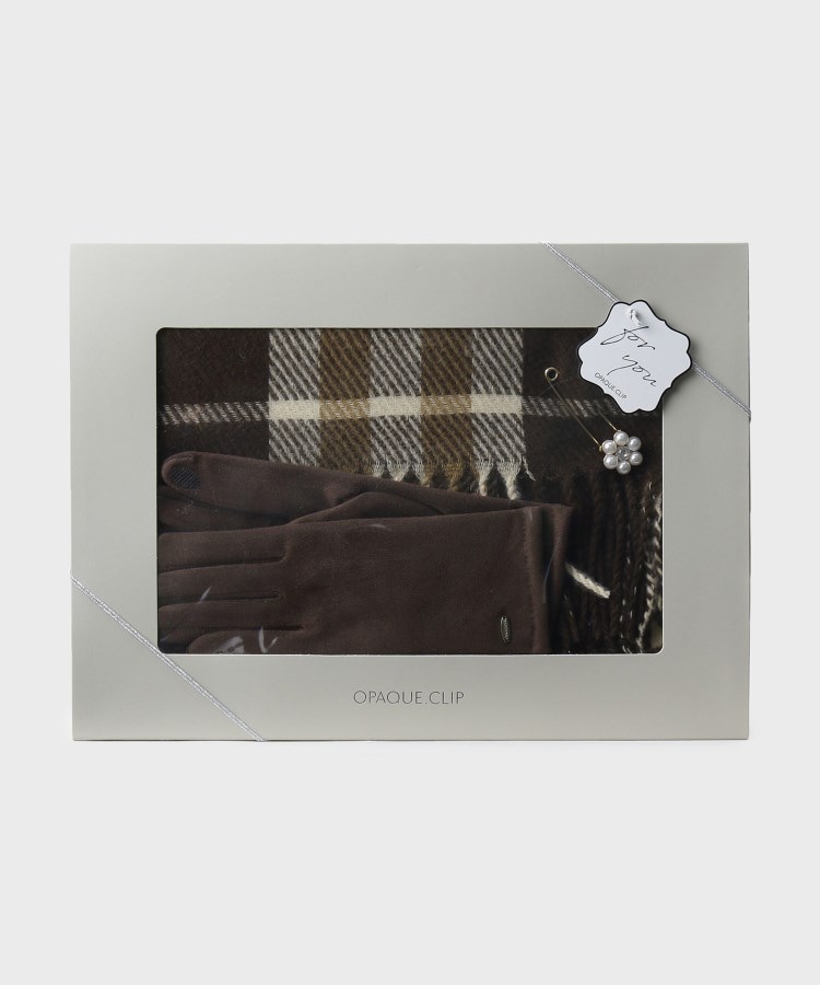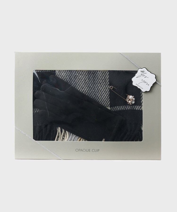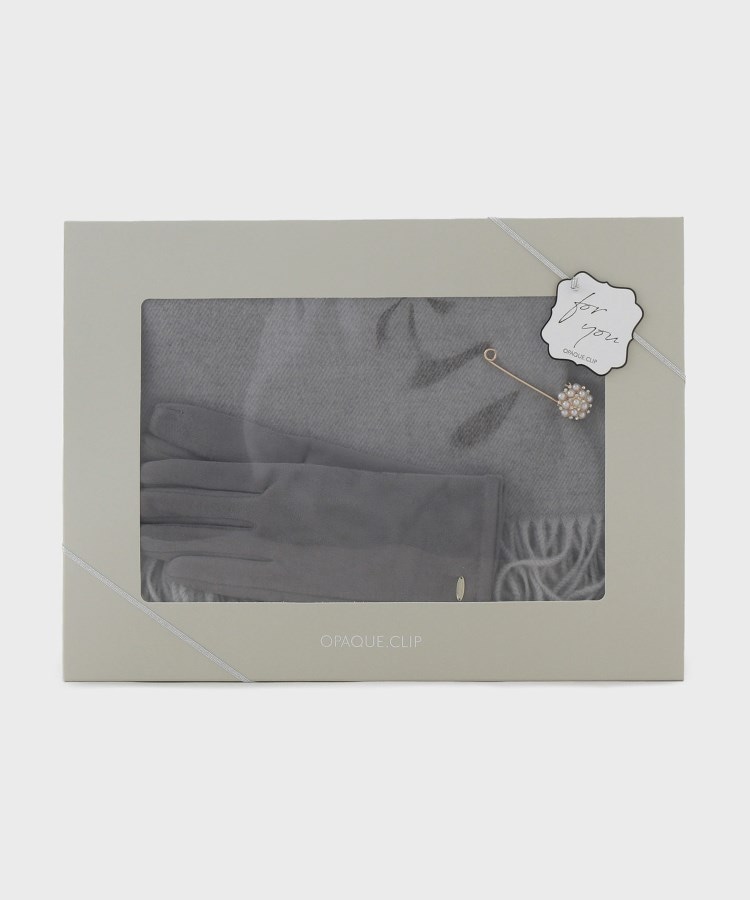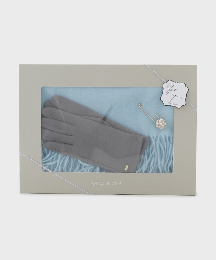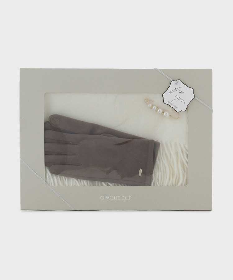大判ストールと上品なストールピン、手袋のセットでホリデーギフトにぴったり!【デザイン】大判ストール・ストールピン・スエード調手袋のセットで、手首のメタルパーツが高見え。ラッピング済みでギフトに最適。【着こなしポイント】ロングコートに巻いてピンで留めれば洗練された表情に、手袋のメタルで手元をさりげなく格上げ。※照明の関係により、実際よりも色味が違って見える場合があります。また、パソコン・スマートフォンなどの環境により、若干製品と画像のカラーが異なる場合もございます。
