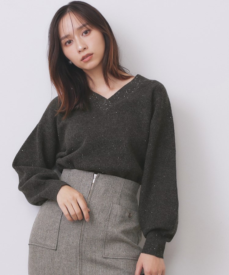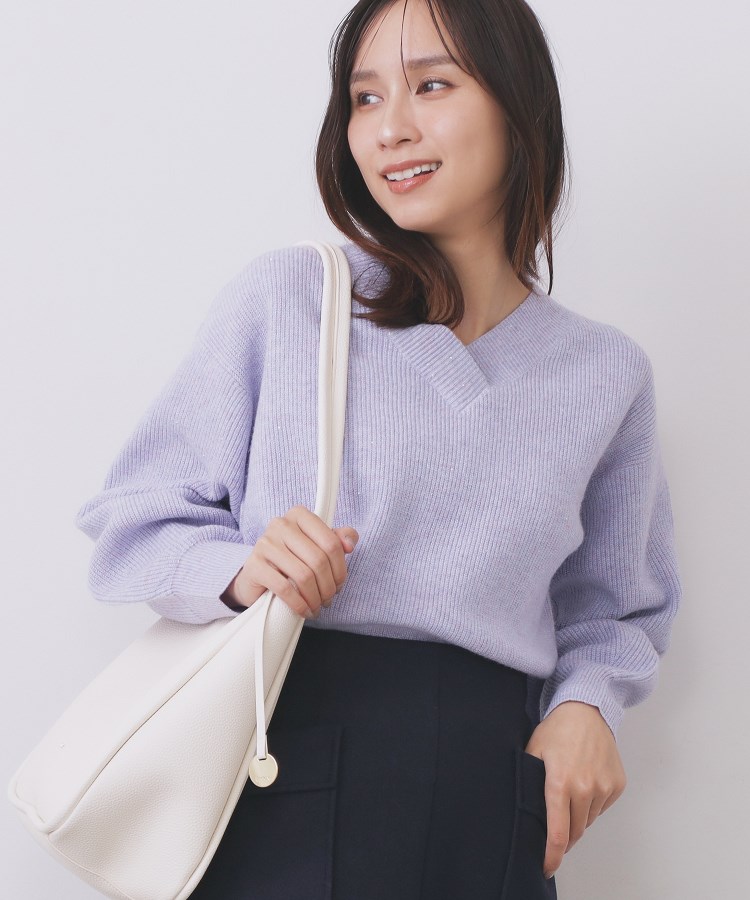 お花モチーフのスパンコールがさりげないウール混の片畦Vネックボクシーパフニット【デザイン】・片畦編みのシンプルなデザインが、豊かな表情を持つニットを演出。・Vネックスタイルが顔まわりをすっきり見せ、女性らしさを引き立てます。・ボクシーなシルエットで、リラックス感を持ちながらも流行を取り入れたスタイリング。・スパンコールが撚糸されており、さりげない華やかさを添えています。・太めの衿や裾リブがアクセントになり、360度きれいに見える工夫が凝らされています。【素材】・ウール混素材による柔らかな肌触りで、快適な着用感を提供。・通気性があり、季節を問わず快適におしゃれを楽しめる。・程よい厚みがあり、温かさを保ちながら快適に過ごせる一着です。・洗濯機でのお手入れが可能、忙しいライフスタイルにもフィット。※照明の関係により、実際よりも色味が違って見える場合があります。また、パソコン・スマートフォンなどの環境により、若干製品と画像のカラーが異なる場合もございます。
