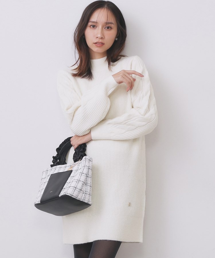 ウール混ケーブルスリーブサックミニ【洗濯機OK】【デザイン】・美しいリブ編みが全体に施され、シンプルながらも洗練された印象。・ケーブル模様のスリーブが、立体感とデザイン性をプラス。・ハイネックデザインが、顔まわりを引き締め、上品な佇まいに。・サックスタイルのミニ丈が、女性らしさを引き立てつつ動きやすさを実現。・フロントには、さりげないロゴのゴールドパーツが施されており、さりげないアクセントになっています。【素材】・ウール混の4者混の素材を使用し、適度な暖かさを保持します。・柔らかな肌触りで、着心地は◎。ストレスフリーなリラックス感を提供。・洗濯機でのお手入れが可能なため、手軽に清潔感をキープ。【仕様】・ポケットなし・裏地なし※こちらの商品はやや透け感があるため、インナーの着用をおすすめします。※照明の関係により、実際よりも色味が違って見える場合があります。また、パソコン・スマートフォンなどの環境により、若干製品と画像のカラーが異なる場合もございます。