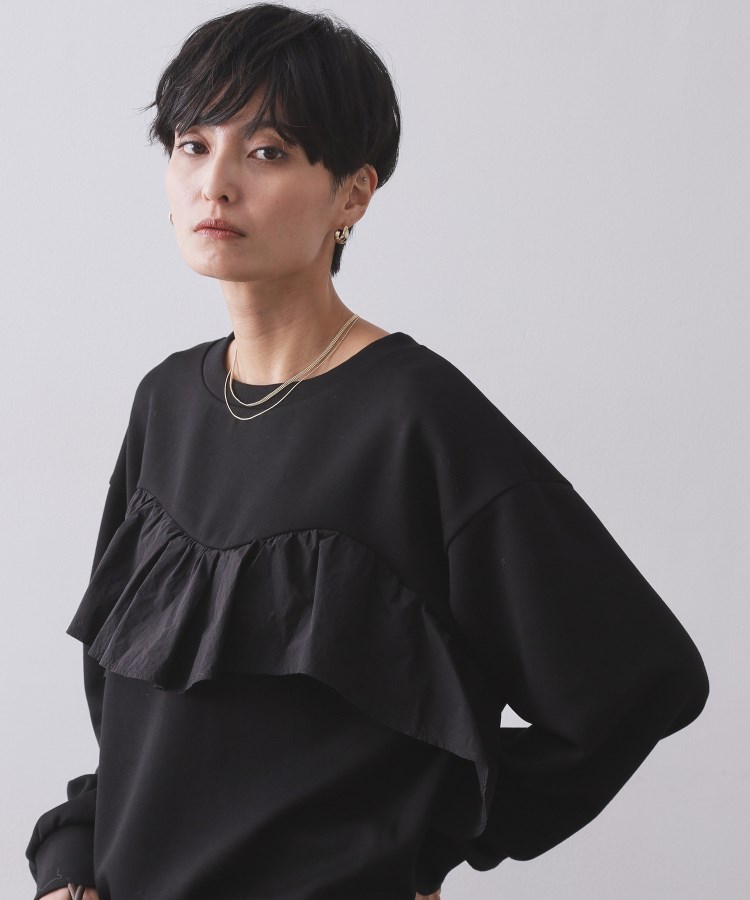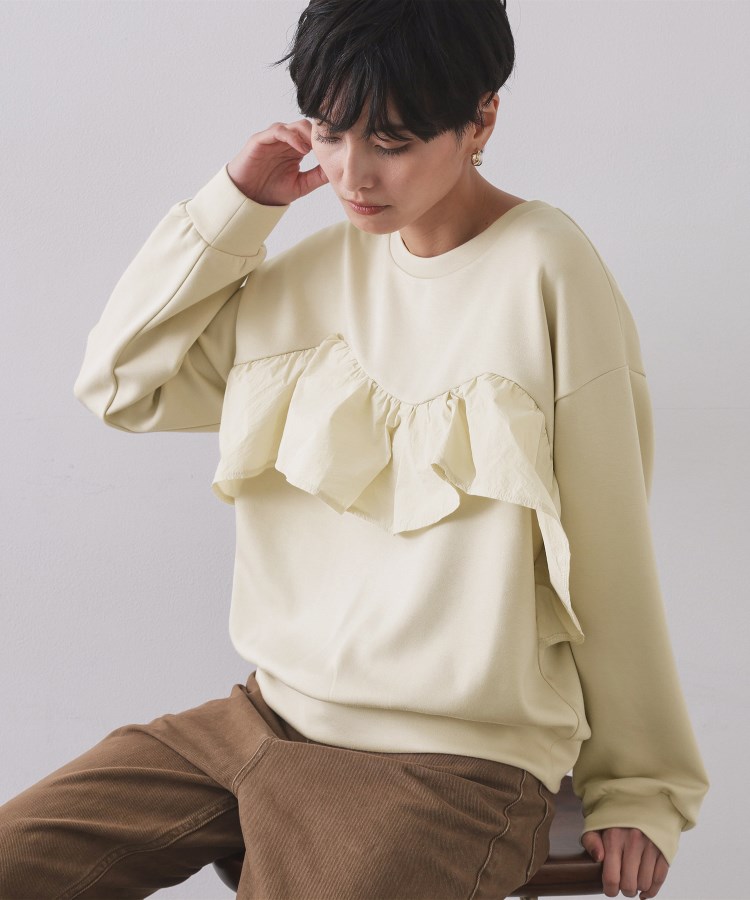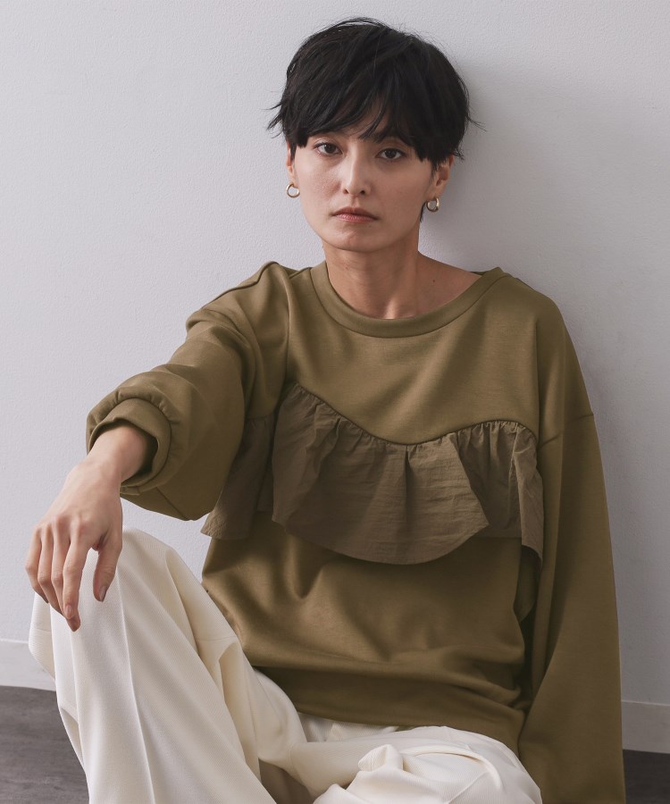 アシンメトリーに入ったタックフレアが華やかなダンボールプルオーバー【デザイン】・滑らかな表面感と程よいふくらみのあるダンボール素材を使用したデザインプルオーバーです。・異素材を使用したタックフレアのフロントデザインがシンプルながら華やからな一枚。・パンツ、スカート問わず合わせやすいジャストな着丈もポイントです。【素材】・膨らみとハリ感のバランスが良く、柔らかさと肌触りの良さも魅力のダンボール素材。・マシンウォッシャブルでご自宅でのお洗濯も簡単。※照明の関係により、実際よりも色味が違って見える場合があります。また、パソコン・スマートフォンなどの環境により、若干製品と画像のカラーが異なる場合もございます。
