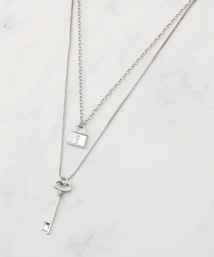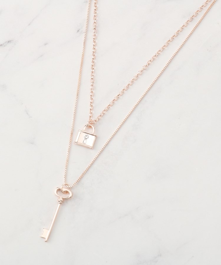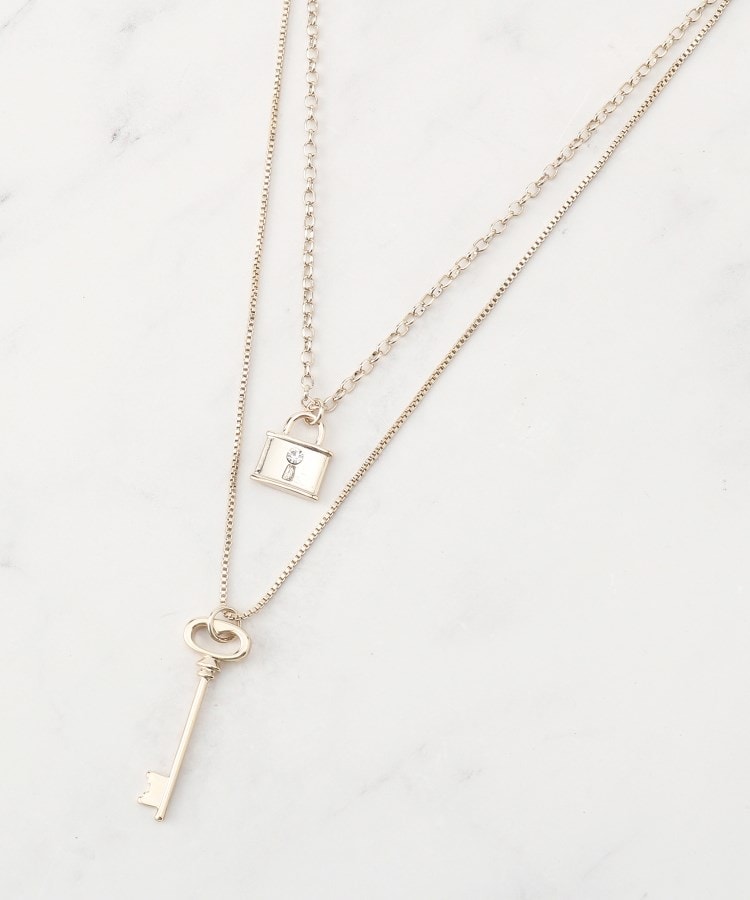 南京錠と鍵のモチーフがかわいいネックレス。※照明の関係により、実際よりも色味が違って見える場合があります。また、パソコン・スマートフォンなどの環境により、若干製品と画像のカラーが異なる場合もございます。