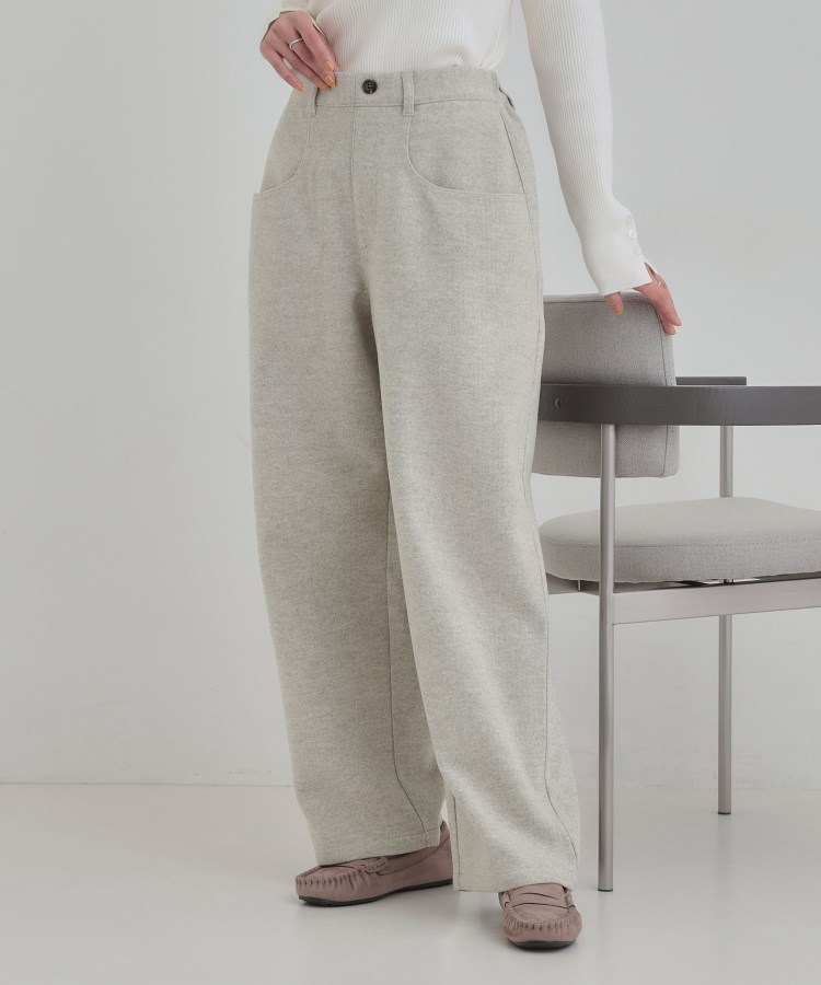 【デザイン】程よくゆとりのあるシルエットで、リラックス感のあるワイドパンツ。大きめのポケットがアクセントになり、シンプルながらカジュアルな雰囲気をプラスします。起毛感のある素材で、あたたかみも感じられるデザインです。【スタイリング】裏毛やニットと合わせて、リラックスした大人カジュアルコーデにぴったりです。大きめのポケットがアクセントになり、いつもとは違ったコーデを楽しめます。【素材】起毛素材を使用しています。【仕様】・ポケット数:横×2 後ろ×2・ウエスト後ろゴム・裏地なし※照明の関係により、実際よりも色味が違って見える場合があります。また、パソコン・スマートフォンなどの環境により、若干製品と画像のカラーが異なる場合もございます。