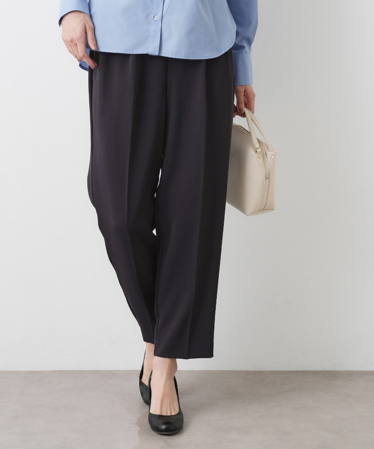 【デザインポイント】細すぎないサイズ感でゆるさもありながら綺麗に見せてくれるセミワイドパンツ。【スタイリングポイント】カジュアルなプルオーバーにもキレイ目なブラウスにも合わせやすいパンツ。【素材ポイント】シワになりにくくお手入れしやすいポリエステル素材。落ち感もありながら体のラインを拾いにくい肉感がポイント。【仕様】・ポケット数:横×2 後ろ飾りポケット×2・ウエスト後ろゴム・裏地あり※照明の関係により、実際よりも色味が違って見える場合があります。また、パソコン・スマートフォンなどの環境により、若干製品と画像のカラーが異なる場合もございます。