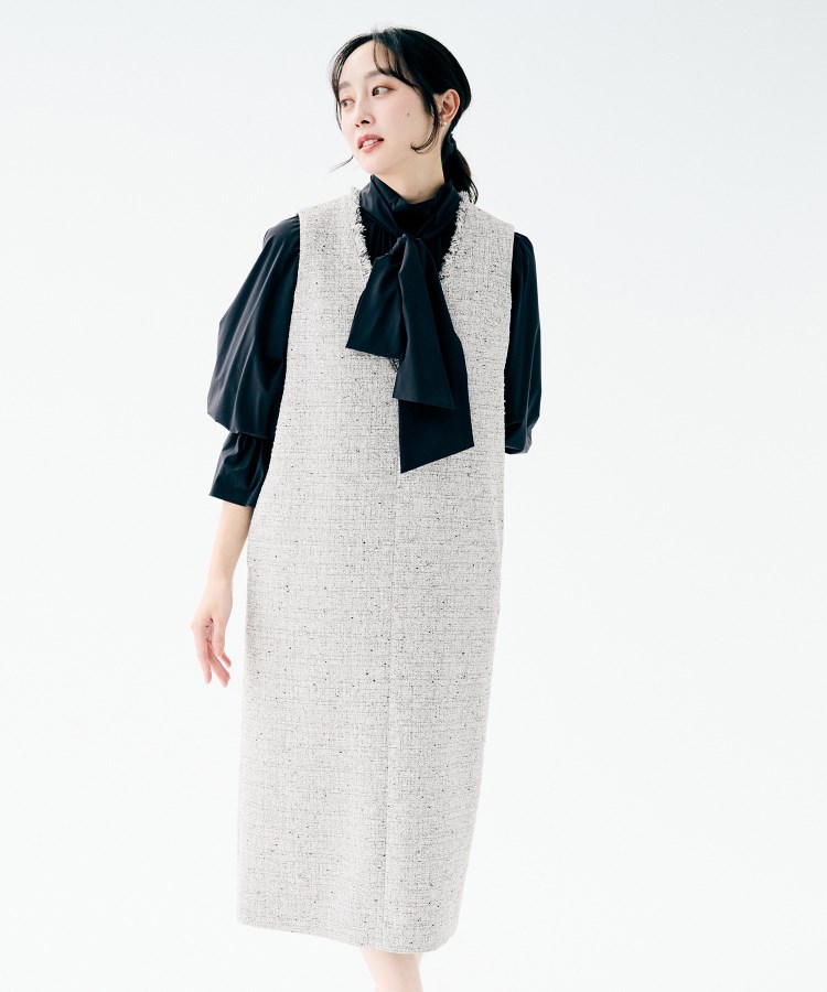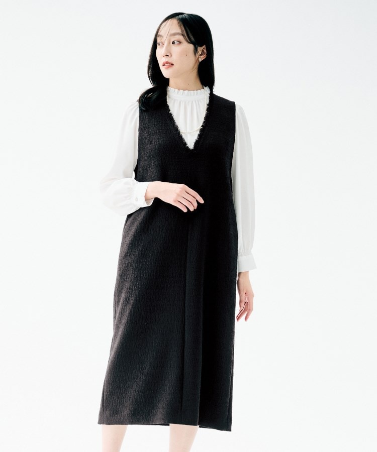【デザイン】深めに開いたVネックデザインが重ね着スタイルを華やかに。インナー次第でカジュアルにもドレッシーにも様変わり。ハイネックニットやブラウスを合わせて、シーズンらしいコーデをお楽しみいただけます。全体的にすっきりとしたシルエットで、細見え効果を期待できるストレートライン。縦長のラインが強調されるデザインでスタイリッシュな印象に仕上がります。【素材感】シンプルなのに程よくミックス感を出した軽量のセミファンシー素材。ファンシーヤーンを多用し凹凸感を出しているのが特徴。ドライタッチで軽くてさらっと着用でき、エレガントにもカジュアルにもデイリーに使用できる素材感に仕上げています。【着こなしポイント】冬のお出かけシーンにはタートルネックとショートブーツを合わせて。あたたかさと洗練さを両立した冬スタイルが完成します。【仕様】・ポケット数:横×2・後ろファスナー・裏地あり※照明の関係により、実際よりも色味が違って見える場合があります。また、パソコン・スマートフォンなどの環境により、若干製品と画像のカラーが異なる場合もございます。