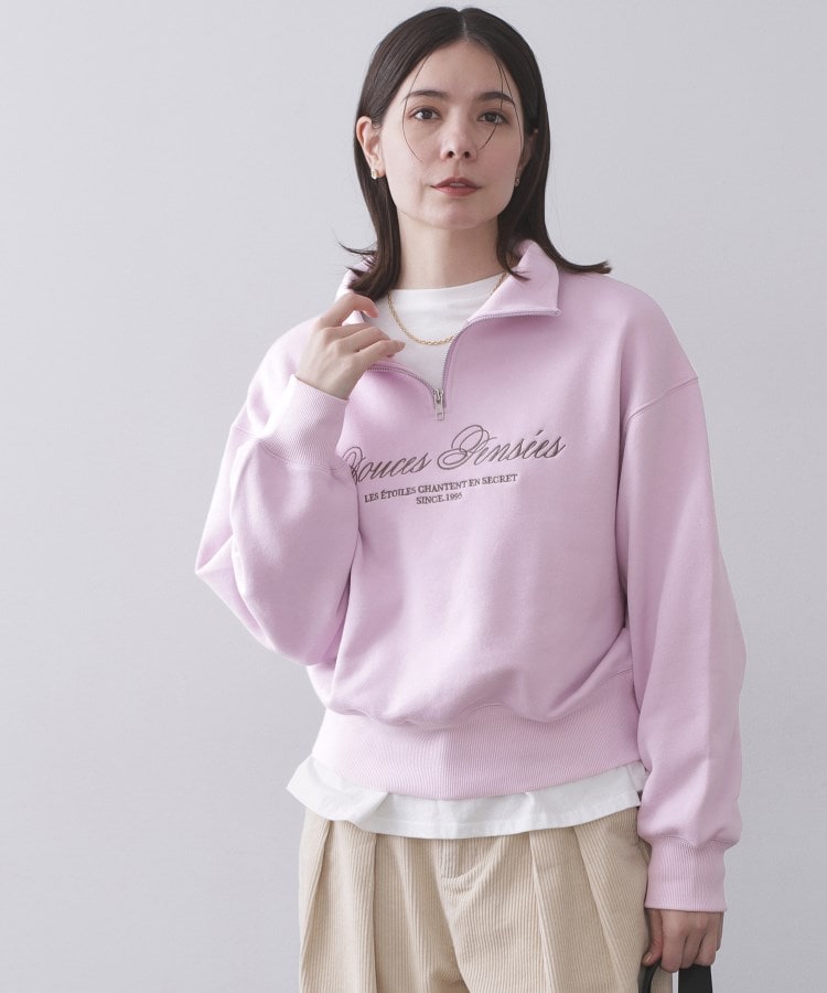 ロゴ刺繍がポイント!ハーフジップで今年らしく着られるスウェットトップス【デザイン】・ハーフジップアップデザインが今年らしい、スウェット素材のプルオーバー。・ゆるめのシルエットと、ややショート丈のバランスがトレンド感もあり◎・ジップを開け閉めすることで、違った襟の表情で着こなせます。・ファスナー下、胸元に大きく入ったロゴ刺繍がアクセント。【素材】・綿/ポリエステル混のスウェット(裏毛)素材を使用。・袖口・裾にはストレッチ性のあるリブ素材を使用しています。・マシンウォッシャブル※照明の関係により、実際よりも色味が違って見える場合があります。また、パソコン・スマートフォンなどの環境により、若干製品と画像のカラーが異なる場合もございます。