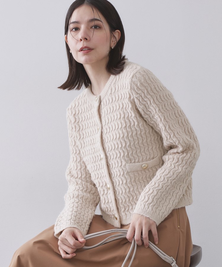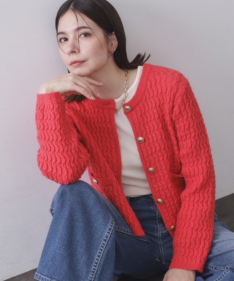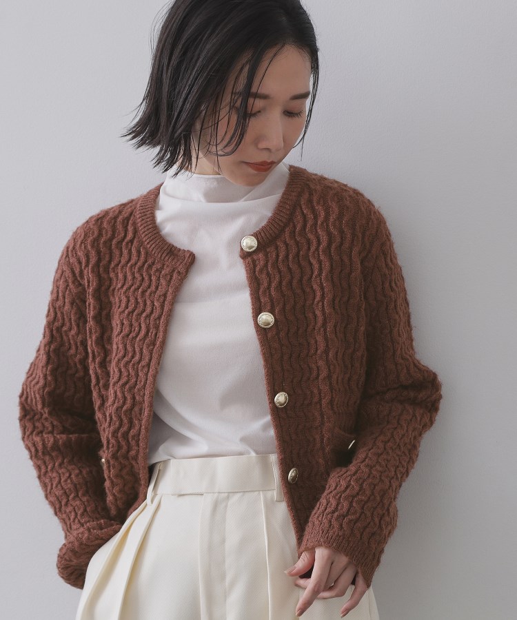 ケーブル編みと金釦がポイントのクルーネックカーディガン【デザイン】・立体的なケーブル編みが華やかな、ほどよい厚みのクルーネックカーディガン。・ややコンパクトな着丈で、ボタンを閉めて一枚ではもちろん羽織りとしてもバランスよく着用いただけます。・ボタンはフチありのゴールドボタンを使用。フロントには飾りポケットを二つ付け、デザインポイントにしています。【素材】・ほどよい厚みのある、毛混のポリエステル混素材を使用。・マシンウォッシャブルでご自宅でのお洗濯も可能。【仕様】・ポケットなし(飾りポケット:前×2)※照明の関係により、実際よりも色味が違って見える場合があります。また、パソコン・スマートフォンなどの環境により、若干製品と画像のカラーが異なる場合もございます。