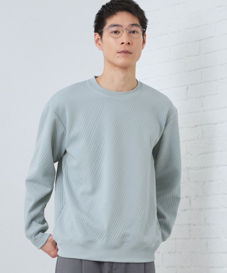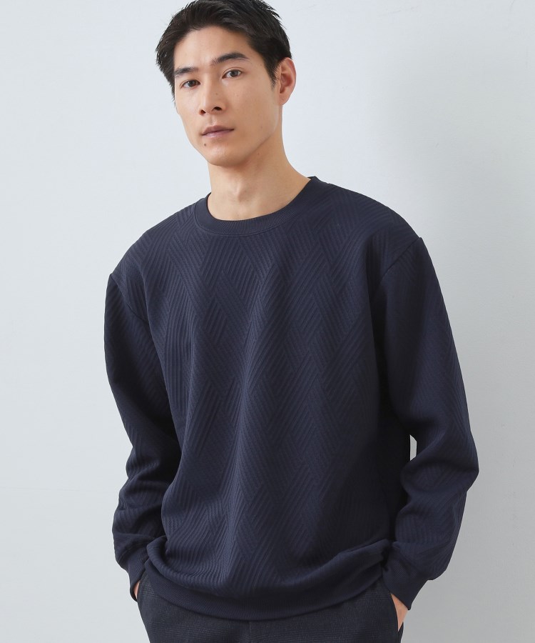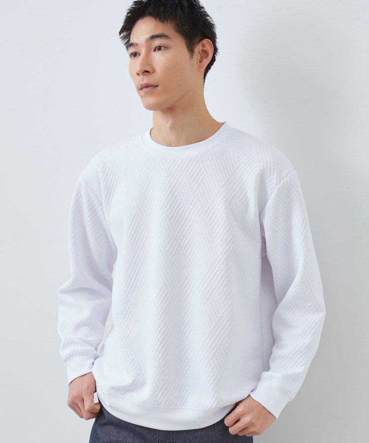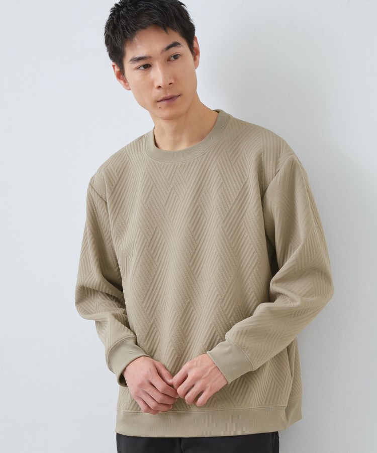 ■ポイント/詳細ふくれジャカードで立体感のある幾何柄を表現したスウェット。カジュアルながらも上品さを感じさせる一枚です。ややリラックス感のあるシルエットと主張しすぎないデザインがコーディネートのメインにも、アウターやジャケットのインナーとしても活躍します。■素材/機能特性ふっくらとした凹凸感が特徴のジャカード素材を使用。柔らかく肌触りの良い風合いで、快適な着心地を叶えます。軽量素材なので春秋冬と長いシーズン着回しやすいのも魅力です。ストレッチ性があるので動きやすく、リラックスした着用感を楽しめます。■おすすめコーディネートデニムやチノパンと合わせたカジュアルスタイルにおすすめ。ジャケットやブルゾンのインナーとしても、柄をさりげなく見せる着こなしが楽しめます。※照明の関係により、実際よりも色味が違って見える場合があります。また、パソコン・スマートフォンなどの環境により、若干製品と画像のカラーが異なる場合もございます。