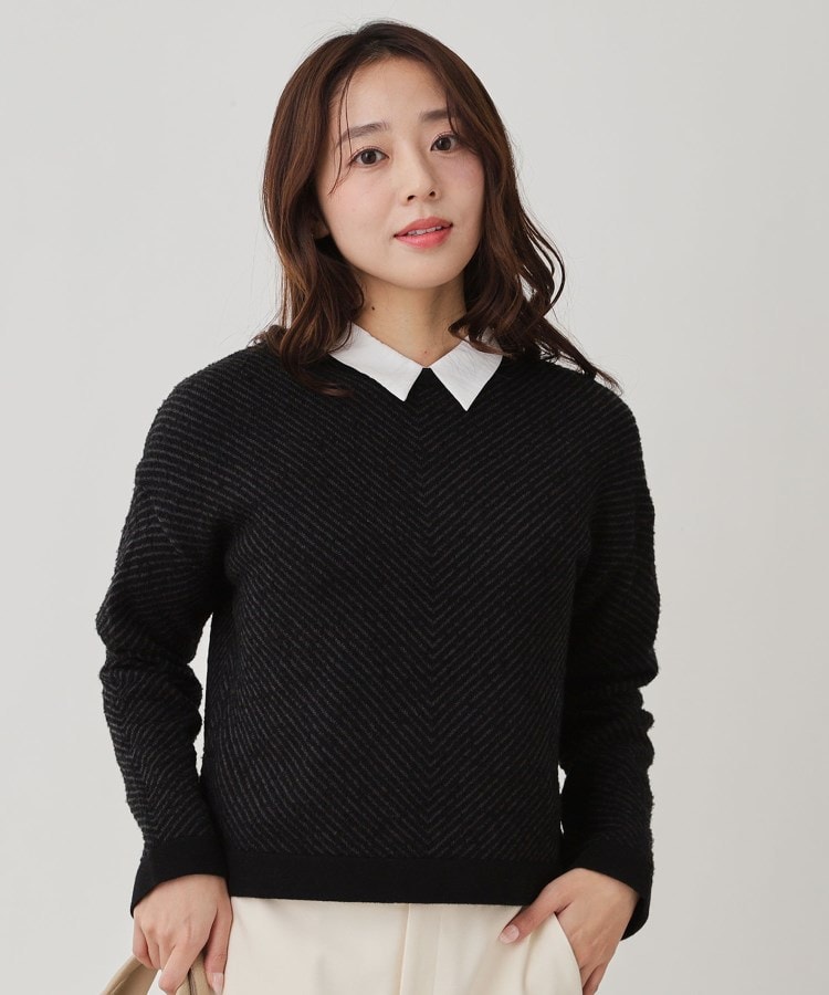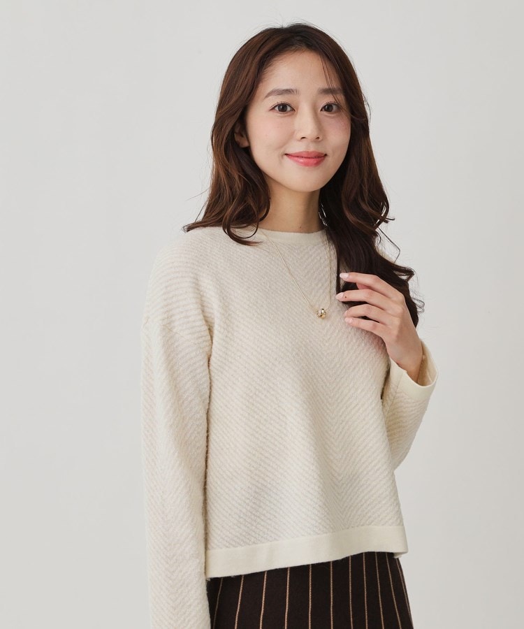 〇デザインポイントモックネックのニットトップス。程よいラメ混のストレート糸を使いスムース編みで仕上げたデイリーにも着やすいニットです。低めのモックネックはニュアンスを出しつつ首元をカバーしてくれます。ヘムラインの前上がりのカーブはボトムとのバランスが決まりやすく、シャツレイヤードにも合うデザインになっています。〇デザインポイントダイアゴナル柄(斜め柄)が目を惹くニットトップス。ループヤーンとストレート糸を組み合わせて表面感を出したジャガードの編地です。ジャガードでも厚ぼったくならない肉感で体離れしてくれます。裾オーバーでボトムとのバランスが取りやすいように短め丈のお作りです。両脇にスリットがあり、ちょっとしてアクセントになっています。ワイドパンツはもちろん、ナロータイトスカートとのコーデもおすすめです。〇素材ポイント形状の違うループヤーンとストレート糸で作る凹凸のあるダイアゴナル柄と厚ぼったくならない中肉の編地がポイントです。コートインしてももたつかないのがポイントです。中肉の編地で、冬から梅春まで長く着て頂ける素材感です。ラメがすでに糸に巻かれてある糸なので、ラメの出方が行き過ぎず、普段ラメを着ない方にもおススメし易いニットです。※照明の関係により、実際よりも色味が違って見える場合があります。また、パソコン・スマートフォンなどの環境により、若干製品と画像のカラーが異なる場合もございます。