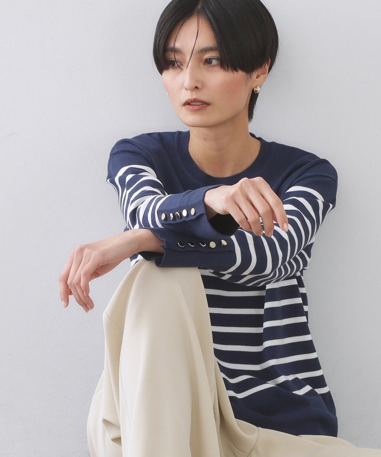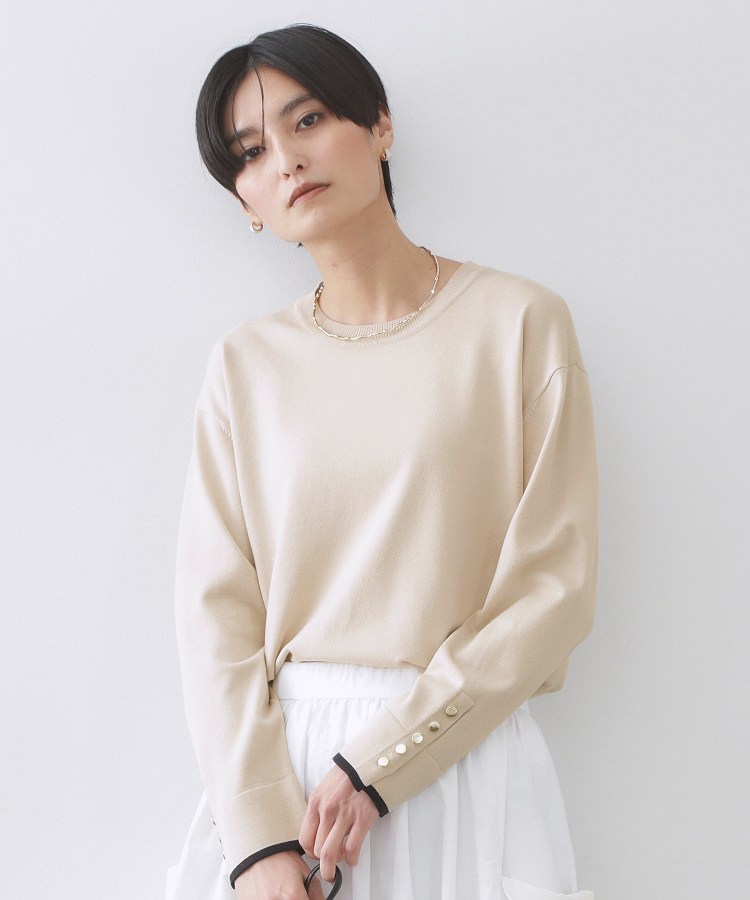 通勤にも、デイリーにも活躍!袖口の金釦とバイカラーがポイントの上品ニット【デザイン】・ややゆとりのあるボクシーなシルエットで、さらりと着られるシンプルなニット。・袖口のスリットに、縦に並んだ小さな金釦が上品なアクセントに。・ボーダー以外の無地4色には、袖&裾に配色ラインを施しています。(※イエロー(031)には白、ライトベージュ(051)には黒、レッド(062)にはベージュ)・腰にかかる着丈で、気になる腰周りや体形カバーにも◎【素材】・ほどよい厚みのある、レーヨン/ポリエステル素材を使用。・フラットな表面感のハイゲージニットで、上品に着られる素材感です。・マシンウォッシャブルでご自宅でのお洗濯が可能。※照明の関係により、実際よりも色味が違って見える場合があります。また、パソコン・スマートフォンなどの環境により、若干製品と画像のカラーが異なる場合もございます。
