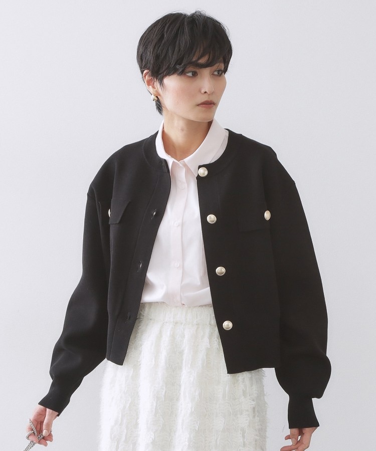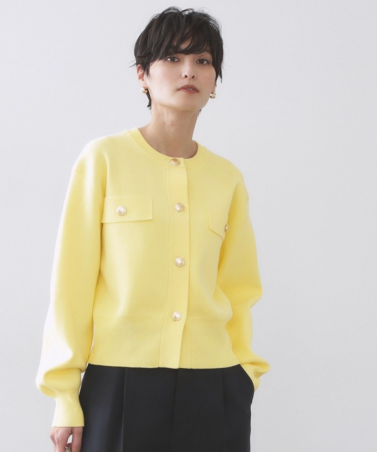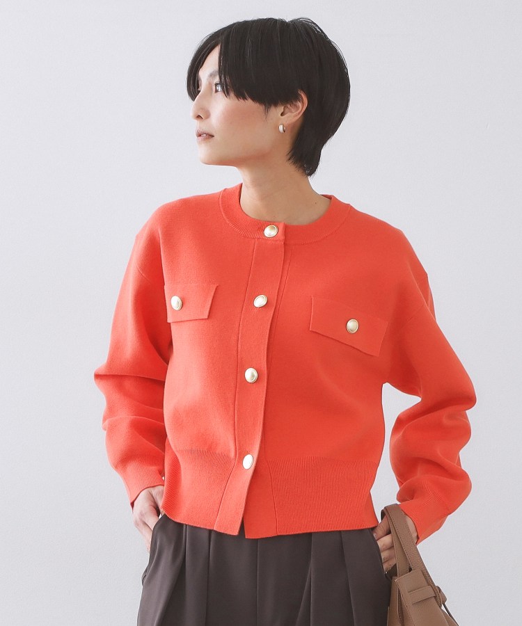 フラップポケット風のデザインと金釦がポイント!一枚着としても羽織りとしても活躍するクルーネックカーディガン【デザイン】・大きめの金釦がポイントのほどよい厚みのクルーネックカーディガン。・ほどよくゆとりがあるボディにすっきりとした着丈で、ボタンを留めて一枚ではもちろん、羽織りとしてもバランスよく着用いただけます。・ボタンはフチありのゴールドボタンを使用。胸元には飾りフラップを二つ付け、デザインポイントにしています。【素材】・ほどよい厚みのある、コットン/ポリエステル混のニット素材を使用。・マシンウォッシャブルでご自宅でのお洗濯も可能。【仕様】・ポケットなし(飾りポケット:前×2)※照明の関係により、実際よりも色味が違って見える場合があります。また、パソコン・スマートフォンなどの環境により、若干製品と画像のカラーが異なる場合もございます。