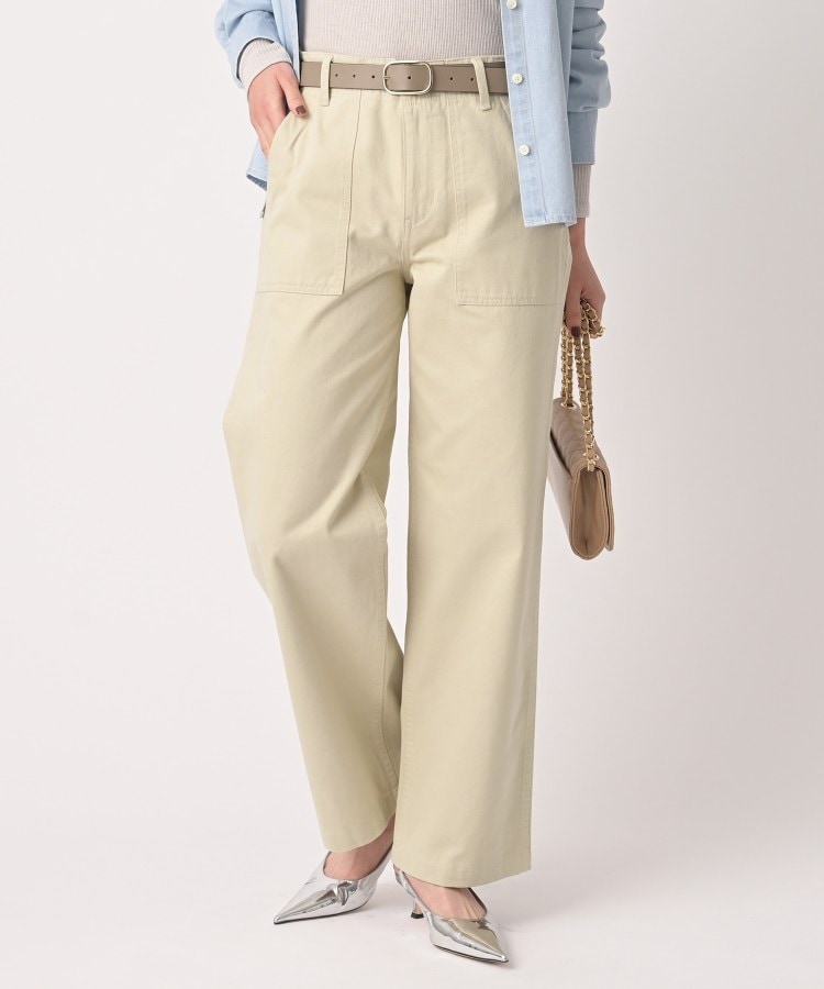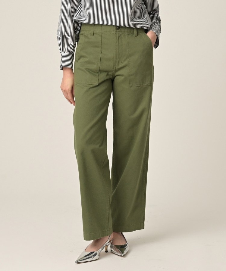 【デザイン】ベイカーパンツの王道デザインを受け継ぎつつ、モダンなシルエットが魅力の一着。本格的なミリタリーテイストを取り入れながら、日常のカジュアルシーンでも取り入れやすいシンプルさを兼ね備えています。ほどよいゆとりのあるストレートシルエットで、動きやすさとスタイリッシュさを両立。フロントのパッチポケットとバックポケットがアクセントになっています。【素材感】コットン100%のサテン組織の素材です。安心感のあるしっかりとした素材感で、きれいめでありながらも製品洗い加工を施すことで程良くカジュアル感を出しました。【着こなしポイント】Aラインシャツ(商品番号:153-85206)やシャーリングフリルネックブラウス(商品番号:153-86214)などのストライプのトップスとのコーデがおすすめです。【仕様】・ポケット数:横×2 後ろ×2・前ファスナー・裏地なし※照明の関係により、実際よりも色味が違って見える場合があります。また、パソコン・スマートフォンなどの環境により、若干製品と画像のカラーが異なる場合もございます。