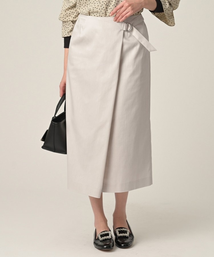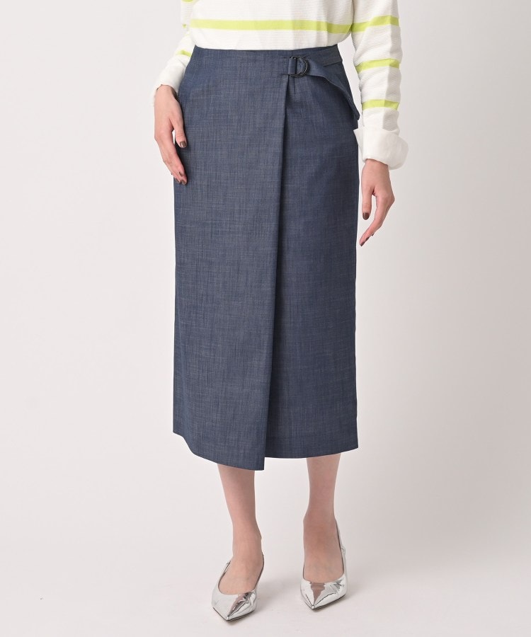 【デザイン】カジュアルすぎないナローシルエットのデニムスカート。キレイめコーデにも溶け込むラップ風のデザイン。ウエスト部分は後ろゴムで穿き心地も◎。しっかり動けるのに、見た目はスラリと美しいラインを演出してくれます。【素材感】ポリエステルスパンを交織したデニム調のシャンブレー素材。一般的なインディゴデニムに比べ、肉感が薄く使いやすく、軽く着用できるのもポイント。綺麗めなのに本格的なデニム調を演出可能にした素材になります。【着こなしポイント】ニットのトップスとのコーデがおすすめです。トレンチコート(商品番号:153-95213)(商品番号:153-95214)と合わせても活躍間違いなしのアイテムです。【仕様】・ポケットなし・後ろファスナー・ウエスト後ろゴム・裏地あり※照明の関係により、実際よりも色味が違って見える場合があります。また、パソコン・スマートフォンなどの環境により、若干製品と画像のカラーが異なる場合もございます。