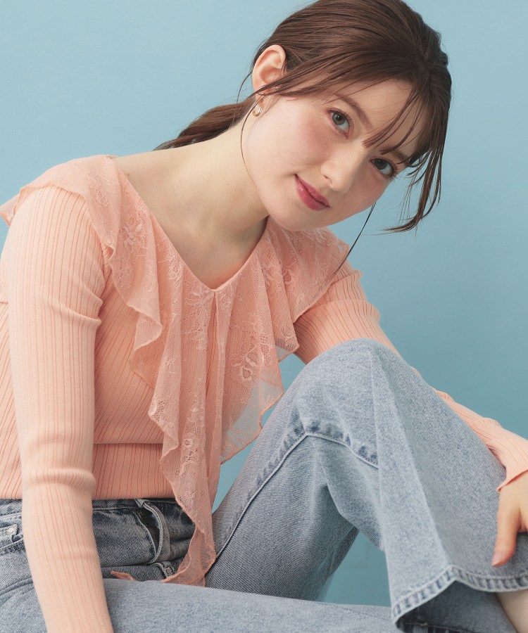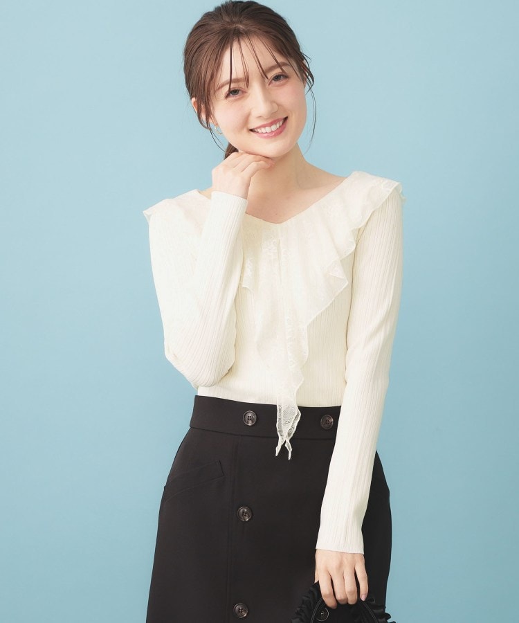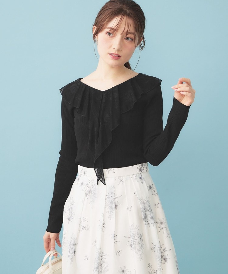 レースフリルVネックリブニット【洗濯機OK/坑ピル】
