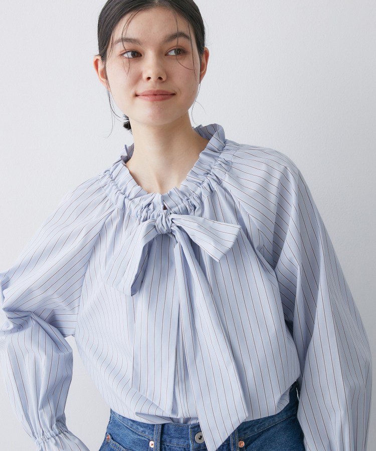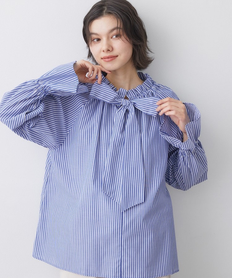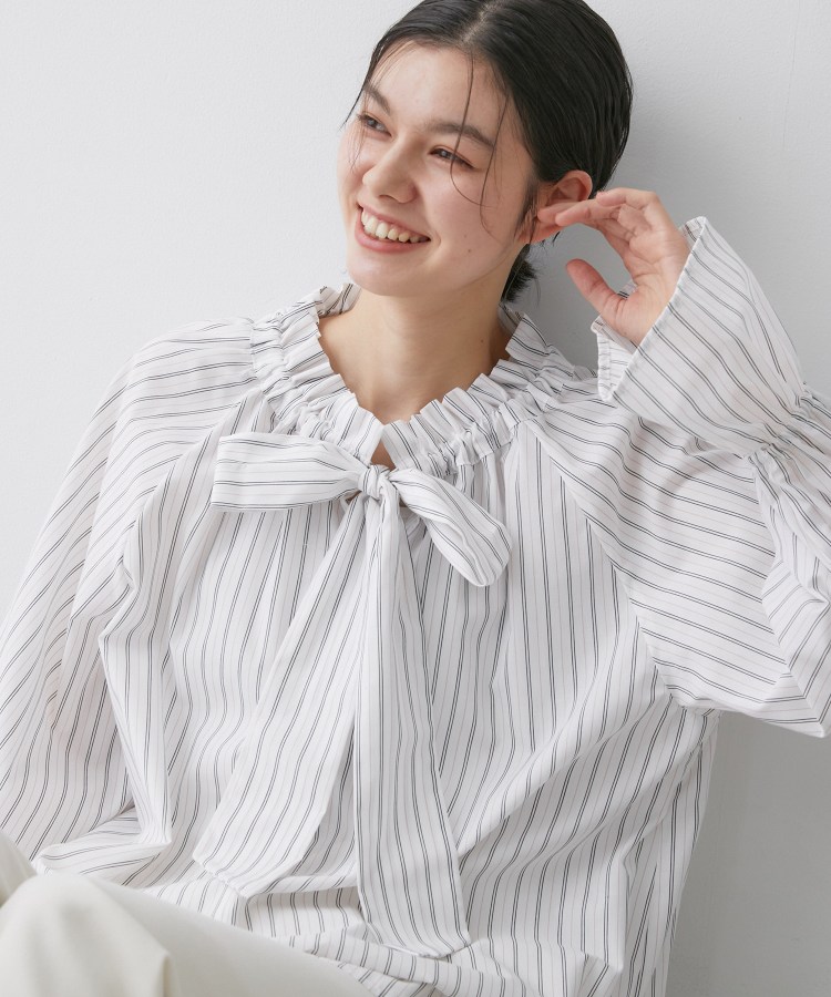 【デザインポイント】繊細なフリルディテールと、存在感のあるボウタイが目を惹くストライプ柄ブラウス。高密度に織り上げた素材を使用し、きれいなハリ感とさらりとした着心地を両立。顔まわりを華やかに見せるボウタイデザインは、結び方次第で印象の変化も楽しめます。袖口にはさりげないボリュームを持たせ、1枚で着ても様になる女性らしいシルエットです。【スタイリングポイント】1枚で主役になるのはもちろん、ジャケットやカーディガンのインナーとしても映えるデザイン。デニムやセミワイドパンツと合わせれば、甘さを抑えた大人フェミニンな着こなしに。きれいめボトムと合わせれば、通勤やきちんとしたシーンにも活躍します。【素材ポイント】細番手の糸を高密度に織り上げた、なめらかでクリーンな表面感の素材。きちんと感がありながらも軽やかな着心地です。洗っても型崩れしにくく、デイリーに扱いやすいのも嬉しいポイント。※照明の関係により、実際よりも色味が違って見える場合があります。また、パソコン・スマートフォンなどの環境により、若干製品と画像のカラーが異なる場合もございます。