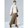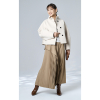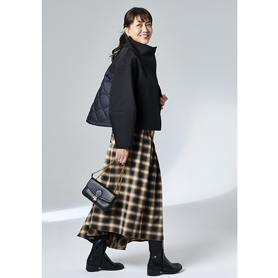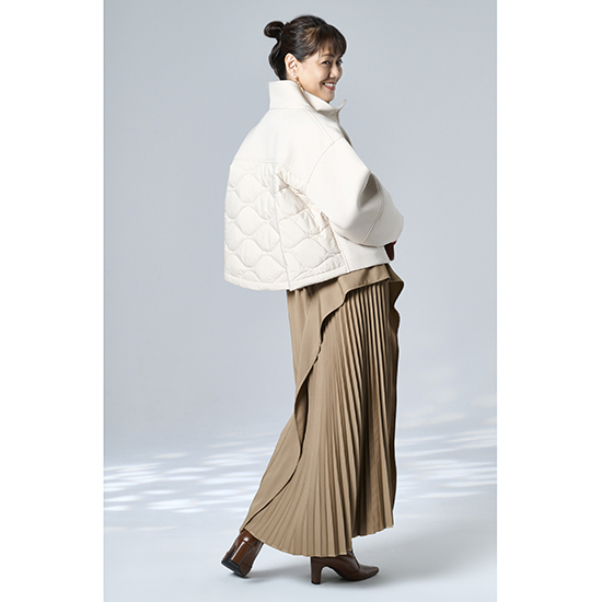 ランタン袖とボディのテントシルエットがポイントです。後身頃の中綿キルト部分が身体から離れテントラインの様なシルエットを出しています。
