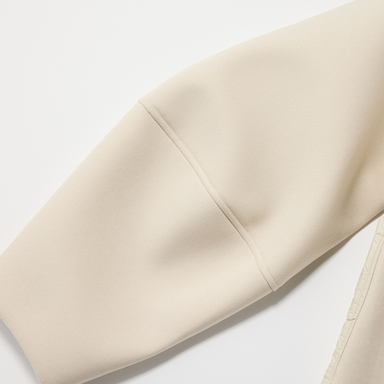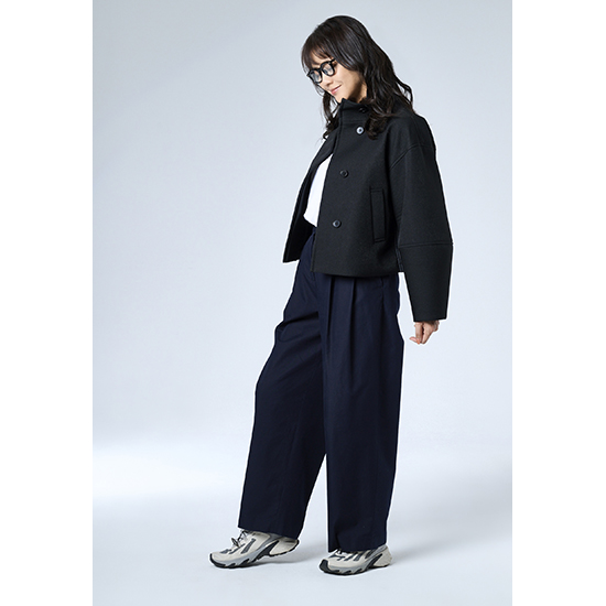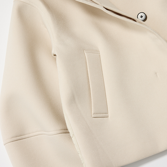 程よいドロップショルダーで、前開きは比翼仕立てですっきりと仕上げました。