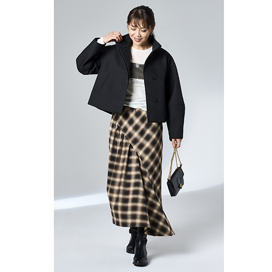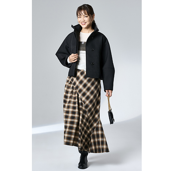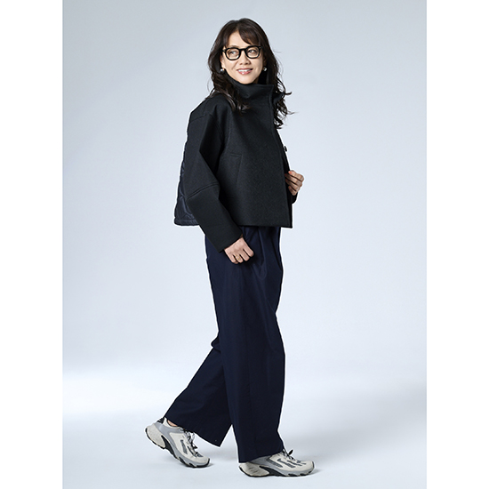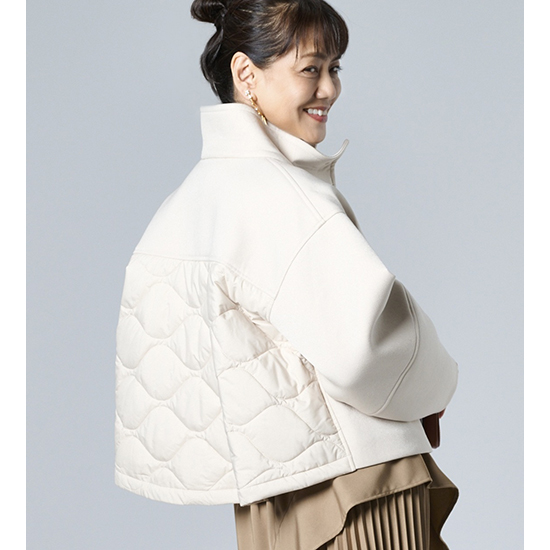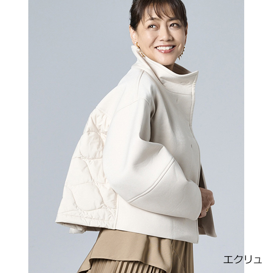 <p><font color=#c31941 size=3>パディング×ボンディングの異素材コンビコート</font><br><br>カルゼのボンディング素材とキルティングをドッキングさせたショート丈のスタンドカラーコートです。<br>ランタン袖とボディのテントシルエットがポイントです。後身頃の中綿キルト部分が身体から離れテントラインの様なシルエットを出しています。<br>程よいドロップショルダーで、前開きは比翼仕立てですっきりと仕上げました。<br><br>撮影/柳瀬渉(人物)、前千菜美(静物)<br>モデル/前田典子、ヘアメーク/ chiSa(SPEC)<br>ディレクション/ 池上裕子、編集/中原麻里子</p>