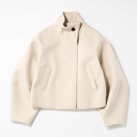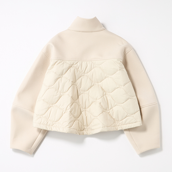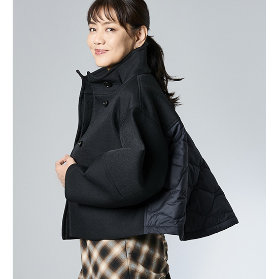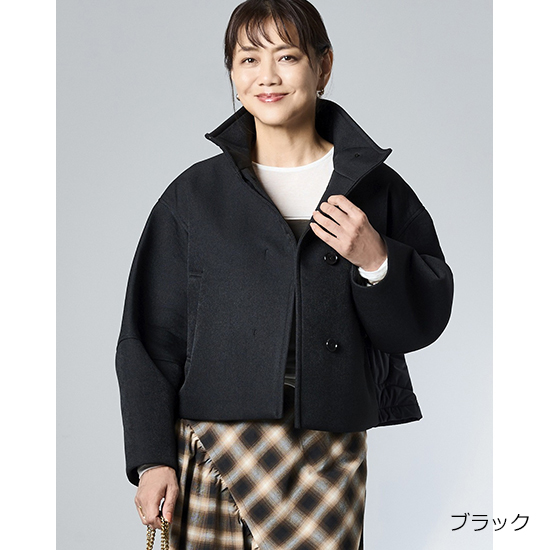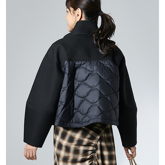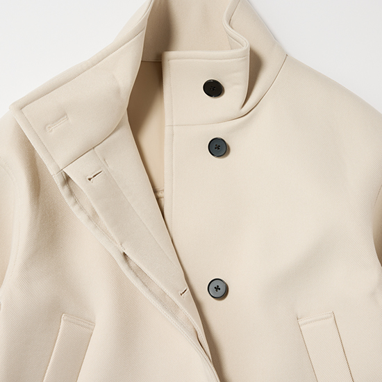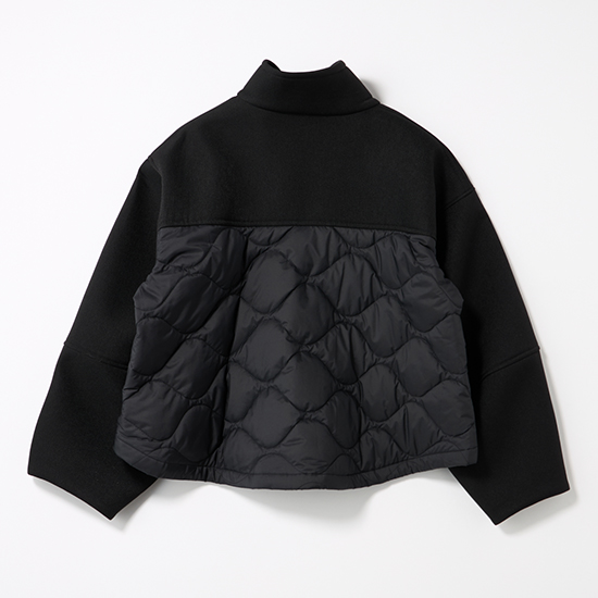 カルゼのボンディング素材とキルティングをドッキングさせたショート丈のスタンドカラーコートです。
