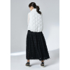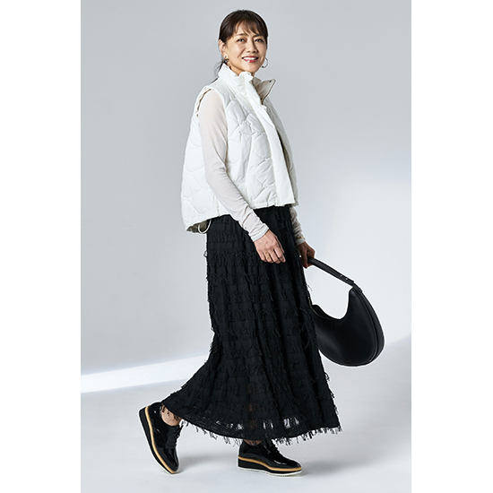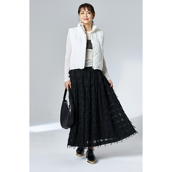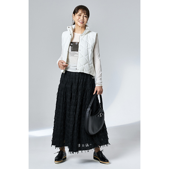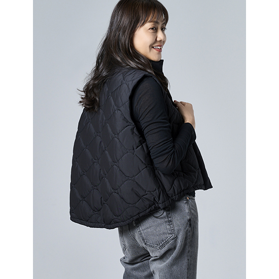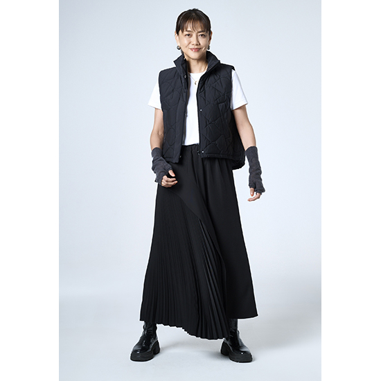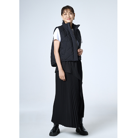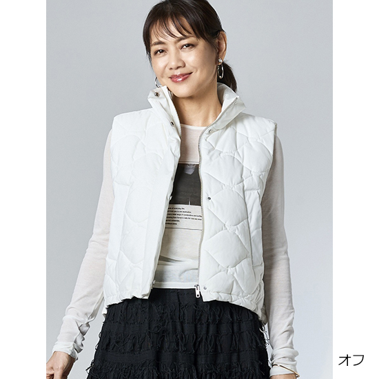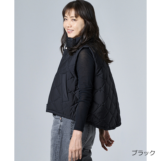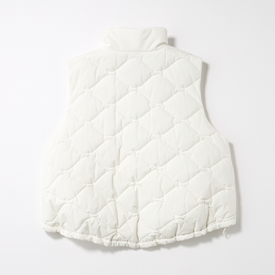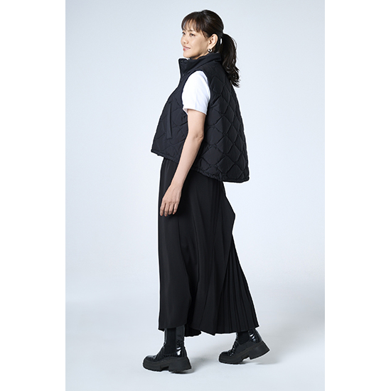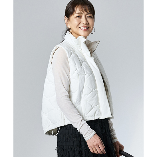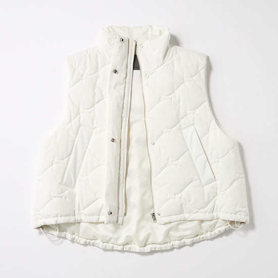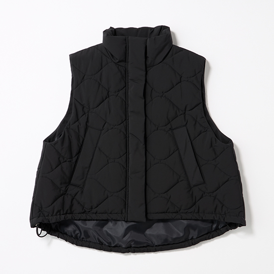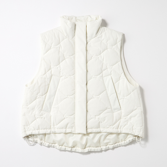 <p><font color=#c31941 size=3>マットな光沢感のタフタ素材を使用したキルティングのジレ</font><br><br>マットな光沢感のタフタを使用した、キルティングのジレです。<br>丈は前後差が付いており、裾に通したドロストコードでシルエットの変化も楽しめます。<br>アームホールは大きめなので、ニットやボリュームスリーブの上からも着用出来ます。着ぶくれしないコンパクトなサイズ感に拘ったモード感のあるアウターです。<br><br>撮影/柳瀬渉(人物)、前千菜美(静物)<br>モデル/前田典子、ヘアメーク/ chiSa(SPEC)<br>ディレクション/ 池上裕子、編集/中原麻里子</p>