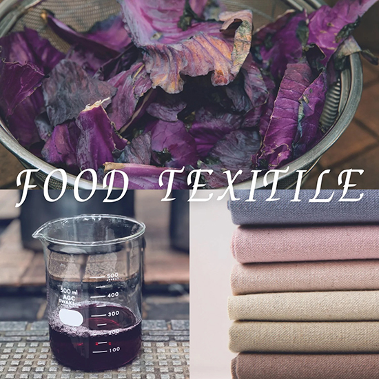 廃棄予定の食材原料を回収し、食材から成分を抽出。日本独自の技術で染料を製造。1つの食材から複数のカラーの染料をつくり、綿・糸・生地・製品へ染色します。