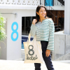 湘南と海を愛する8HOTELの思いが、サステナブルなバッグになりました。正方形のトートに、ホテルのビッグロゴプリントが目を引きます。