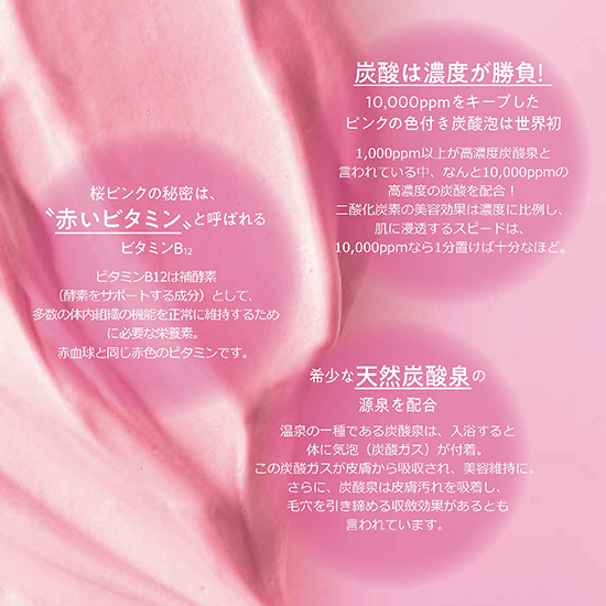 - 水、BG、グリセリン,ジグリセリン、LPG、PEG-25フィトスタノール、ベヘン酸、ステアリン酸、セテアリルアルコール、TEA、ベヘニルアルコール、二酸化炭素、温泉水、シアノコバラミン、炭、PEG-150、ポリグリセリン-10、ミリスチン酸ポリグリセリル-10、クエン酸、デヒドロ酢酸Na、エタノール、フェノキシエタノール、香料、赤102
