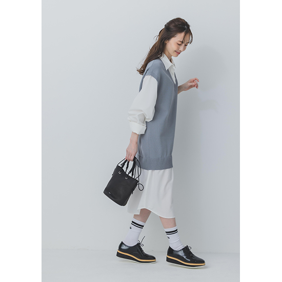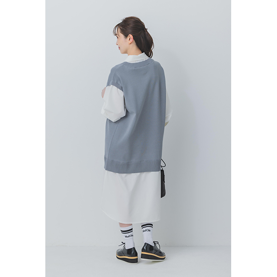 一枚でコーディネートが完成し、リラックス感のあるシルエットと異素材のコントラストがモードな印象を引き立てます。