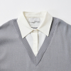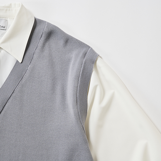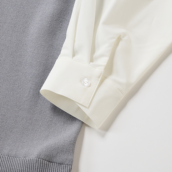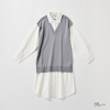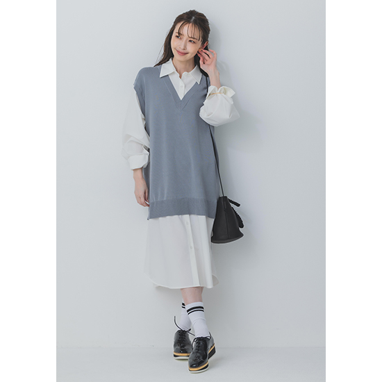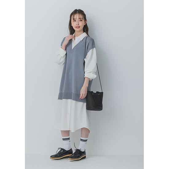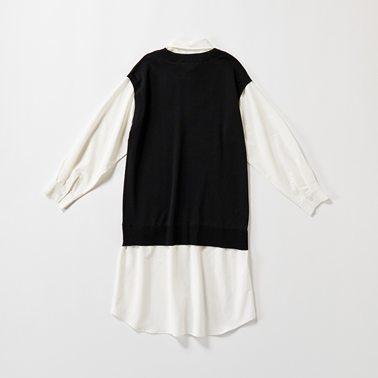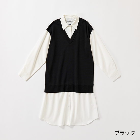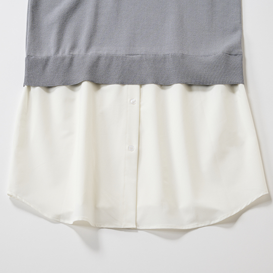 シャツとニットをレイヤードしたように見えるコンビネーションデザインのワンピース。
