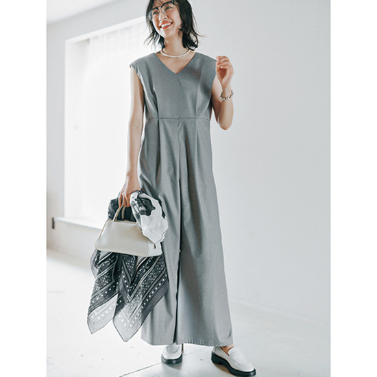 オールインワンは浅めのVネックとハイウエスト切替で、