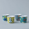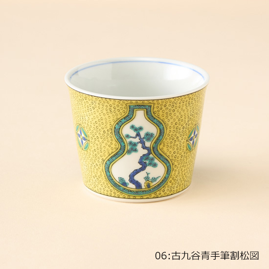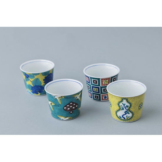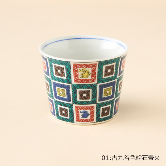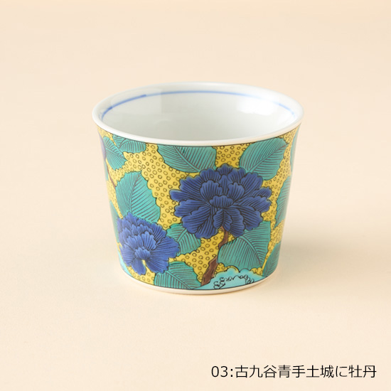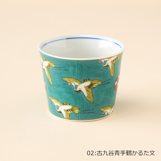 <p><font color=#c31941 size=3>絵画的で大胆な上絵付けが細部まで美しい九谷焼。<br>テーブルを上品に、華やかに彩ります。</font><br><br>大正初期に九谷焼の絵描きとしてスタートした青郊窯。<br>九谷焼の産地である石川県能美市にて、独自のノウハウを駆使して<br>日常使いのできる高クオリティな九谷焼をお届けします。<br><br>お蕎麦などの麺類はもちろん、お茶、コーヒー、デザートカップなど、様々な用途で使える猪口シリーズ。<br><br>*電子レンジ可 / 食洗機可<br>*食器洗浄機のご使用は、上絵の劣化を進める恐れがありますので、手洗いをお勧めいたします。<br><br>*化粧箱入り<br><br>【01:古九谷色絵石畳文】<br>古九谷で最も古い幾何学文様です。随所に描かれている鳳凰も相まって、大変縁起の良い模様となっています。<br>一見、単純な桝型の繰り返し文様に見えますが、桝目の中は、七宝文、丸紋、菱文など変化をつけた小紋柄が細やかに描き込まれています。<br><br>【02:古九谷青手鶴かるた文】<br>日本的な鶴の文様と、異国的なスペードの模様。そして、そのスペードの中にはいくつものハート模様が散りばめられています。<br>当時の最先端の意匠を取り入れた、意欲的な絵柄です。<br><br>【03:古九谷青手土城に牡丹図】<br>下方のうねるような土坡(土堤)と三つの牡丹の花。紺色の牡丹と、黄色の地の色は、相反する色の組み合わせですが、<br>それが牡丹の花を美しく引き立て、迫力のあるものに仕上げています。豪快で華やかで、人気の一皿です。<br><br>【04:古九谷青手瓢箪割松図】<br>青(緑)、紫、紺青、黄、赤の九谷五彩のうち、紫、緑、黄の三彩で構成された様式を青手といいます。<br>古来よりとても縁起の良いものとされ、除災招福のお守りや魔除けとして広く用いられてきた瓢箪の絵を青手で描いた絵柄となります。</p>