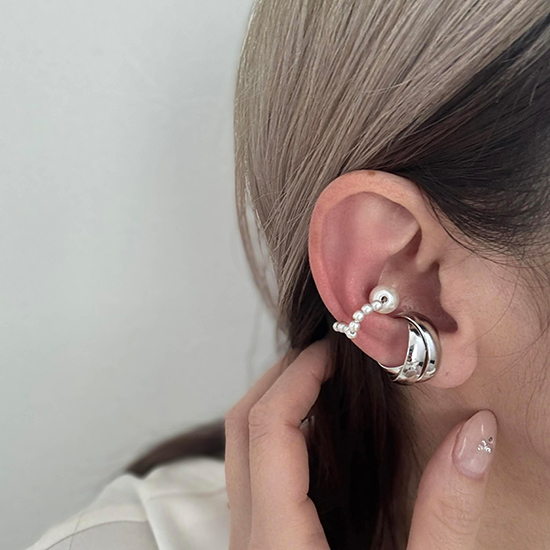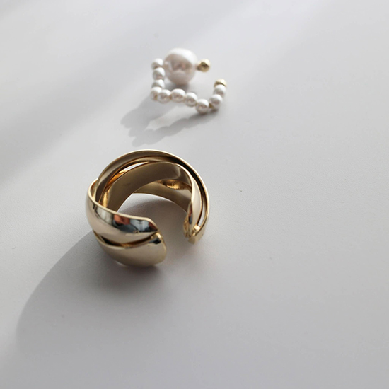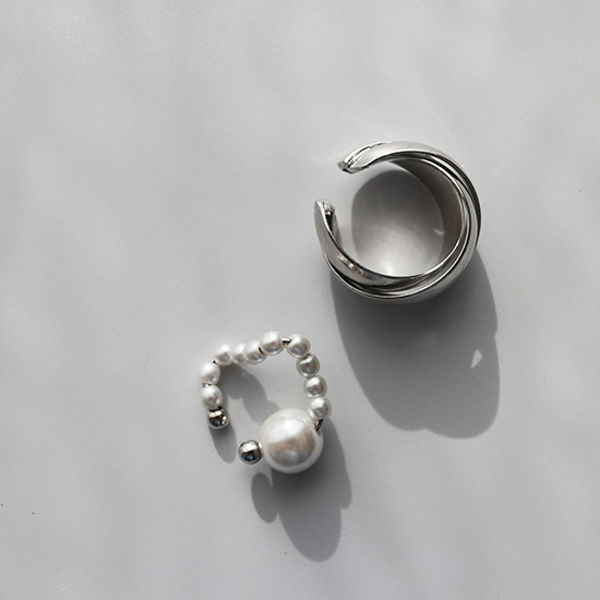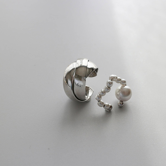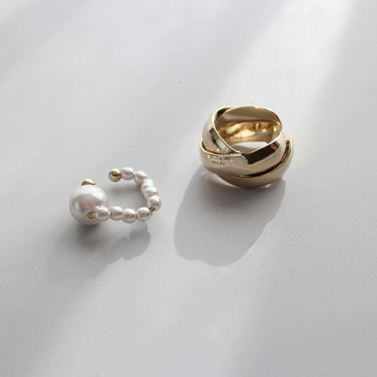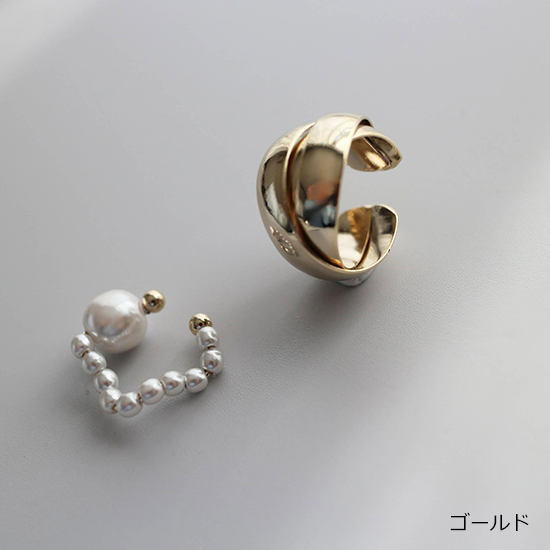 丸みのあるボリュームメタルカフと、 パールの軽やかさを添えたイヤーカフの2点セット。