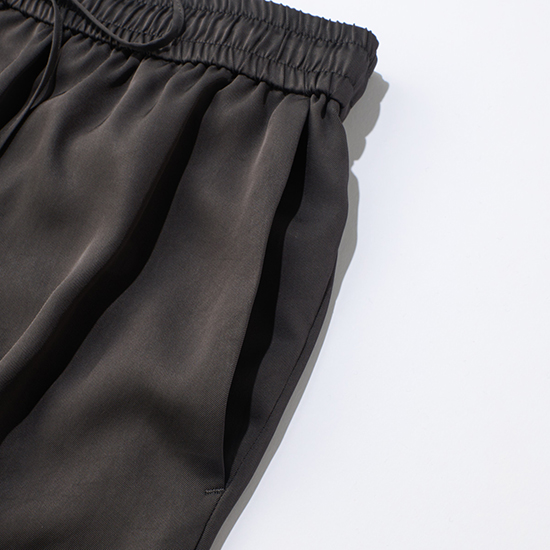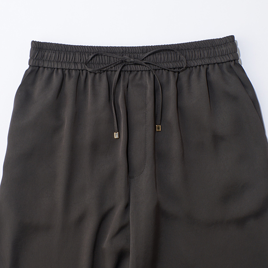 ウエスト総ゴム仕上げでも、お腹周りもスッキリ見せてくれ、ドロストコードの先の金具もポイント。