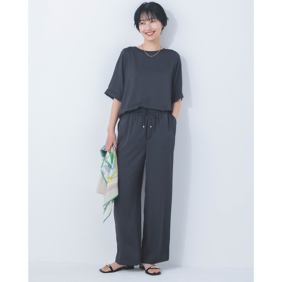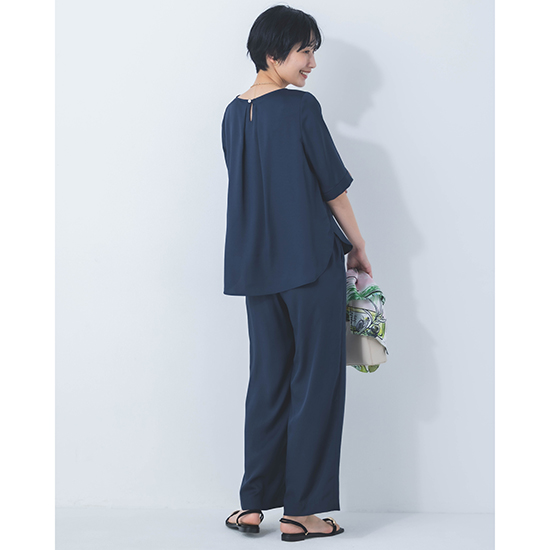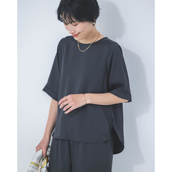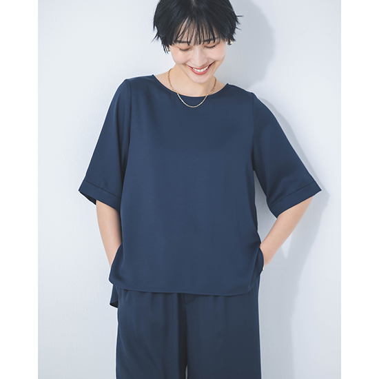<p><font color=#c31941 size=3>高機能性と美シルエットで、ファンの多いDONEEYUのセットアップ<br>上半身をスッキリと女性らしく見せてくれる5部袖プルオーバー</font><br><br>オール日本製で、高いデザイン性と上質な素材に縫製が魅力の「DONEEYU(ドニーユ)」。<br><br>高機能性と美シルエットで、ファンの多いDONEEYUのセットアップのプルオーバー。<br><br>ビンテージ加工をすることで、ナチュラル感のあるシルクのような風合いが魅力のサテンツィル素材を使用した新作。<br><br>見た目以上の軽さと、上品な光沢感が魅力で、お仕事から休日、旅行まで様々なシーンで愛用できます。<br>また、合わせるアクセサリーや足元によってはオケージョンまでこなせる万能力。<br><br>肘が見え隠れるする5部袖は、上半身をスッキリと女性らしく見せてくれ、一枚着、インナー使いと、着回し力も抜群です。<br>首周りのラウンドカットも絶妙で、どんなアクセサリーとも相性が良く、もちろんノンアクセでも上品です。<br><br>UVカット・接触冷感機能を兼ね備え、ナチュラルストレッチ感もプラス。<br>軽やかでノンストレスの着心地は、これからのシーズンに大活躍してくれるはず。<br><br>【セットアップ商品】<br><br>モデル身長166cm<br><br>※手洗い可能</p>