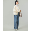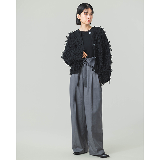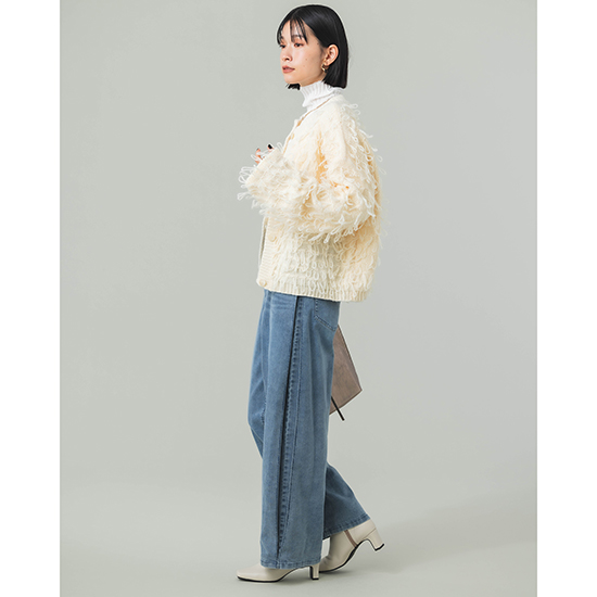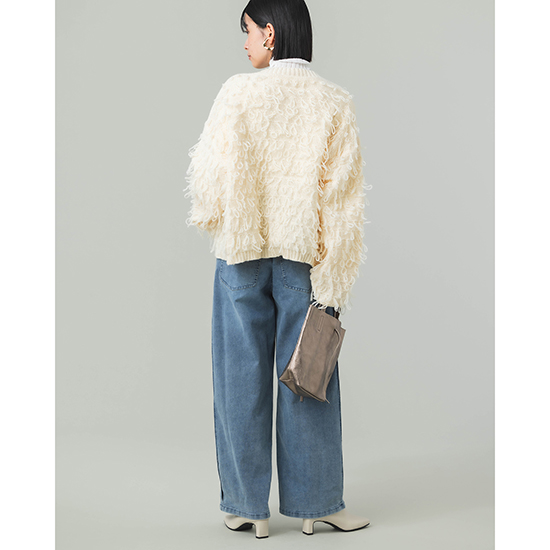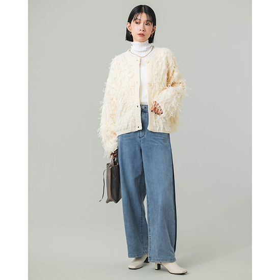 緩いループのフリンジカーデはカジュアルに見えながらも程よいコンパクトさでキレイ目のボトムとも好相性。