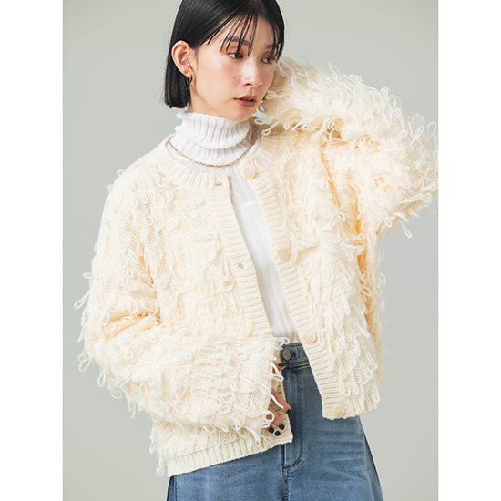 緩いループのフリンジカーデはカジュアルに見えながらも程よいコンパクトさでキレイ目のボトムとも好相性。<br />