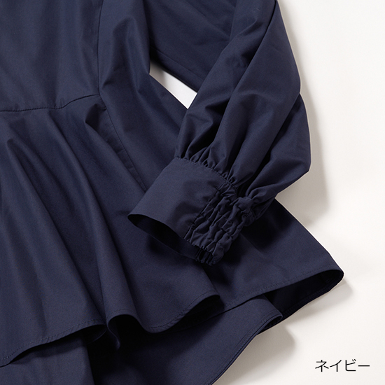 一見シンプルながら、着るだけで華やぐ立体的なデザインが魅力。裾に広がるペプラムデザインは、ギャザーではなく自然に広がるパターンにすることで、甘さを抑えて大人の洗練感を引き立てます。