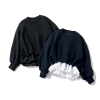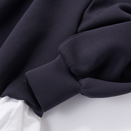 ネイビー:ベースはふんわりシルエットのネイビースウェット、その裾に白のタフタ素材をドッキング。まるでレイヤードしたような軽やかな華やぎを与えてくれます。<br />