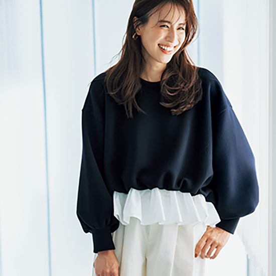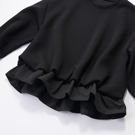 ブラック:ブラックスウェットの裾に、同色のタフタ素材をドッキング。色味を抑えることで、華やぎあるフリルも大人仕様に。<br />