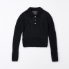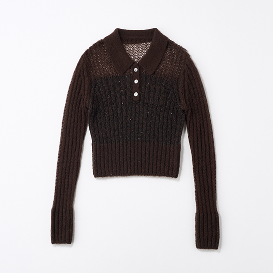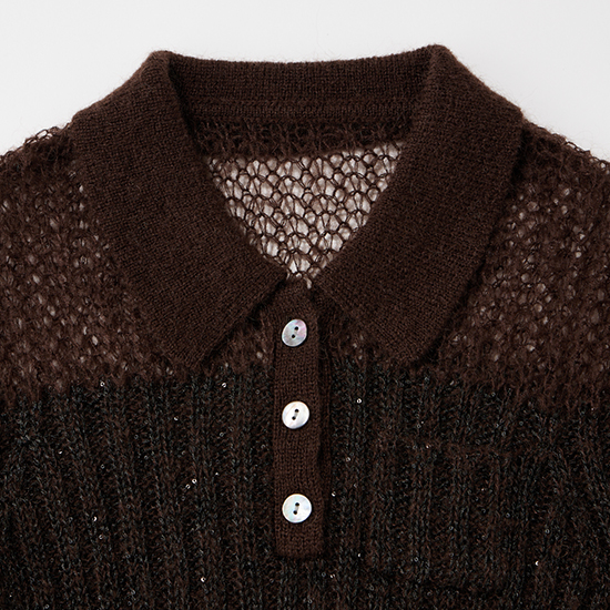 透け感のある編地とリブ編みを切り替えた、モードな表情のニットポロ。