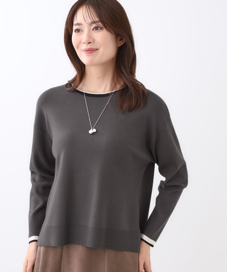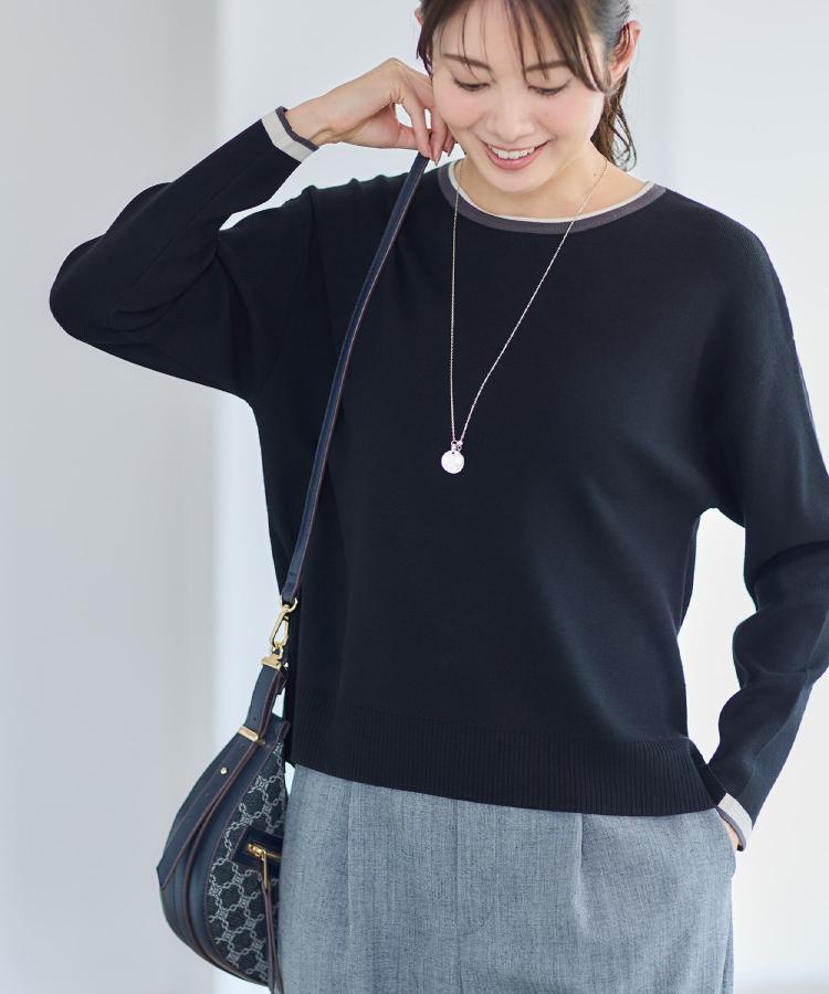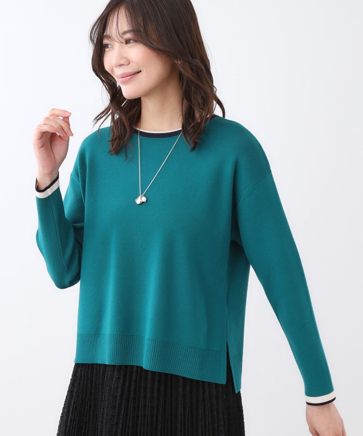 【WEB先行カラー】ブルー(597)【デザイン】総針のキレイな目面で身体のラインを拾い過ぎず、ゆるめのフォルムが昨年好評だったニット。前後差があるデザインで合わせやすく、同素材のスカートとセットアップとしてもお召しいただけます。後ろ中心にはボタンがあり、端々の三配色がアクセントになっています。※同素材のシリーズにスカート(101‐74035)、ベスト(101‐24035)がございます。【素材】ポリエステル(PBT)はストレッチヤーンなのでテンションもあり、膨らみ感もあって着心地の良い素材です。強撚していますのでさらっとして清涼感もあり、度目も詰まっていますので目面もキレイです。※照明の関係により、実際よりも色味が違って見える場合があります。また、パソコン・スマートフォンなどの環境により、若干製品と画像のカラーが異なる場合もございます。