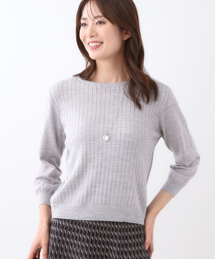【WEB先行カラー】グレー(011)【デザイン】インナーに着用した際にすっきり見えるような縦柄の編地でおつくりしたニット。※同素材のカーディガン(101‐34045)とアンサンブルでお召しいただけます。【素材】オーストラリア産のエクストラファインメリノを使用し、原毛の段階で軽い防縮加工を施しているため発色性が良い素材です。手洗い洗濯が可能で、ぬめりのある風合いとソフトな肌触り感と膨らみがあるのが特徴です。※照明の関係により、実際よりも色味が違って見える場合があります。また、パソコン・スマートフォンなどの環境により、若干製品と画像のカラーが異なる場合もございます。