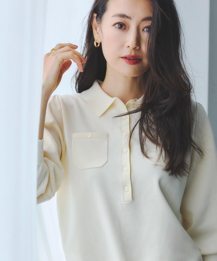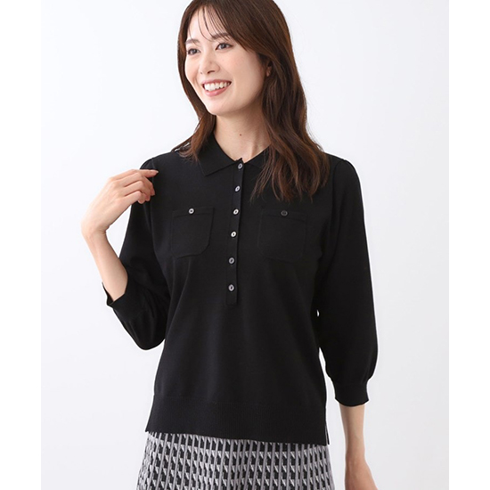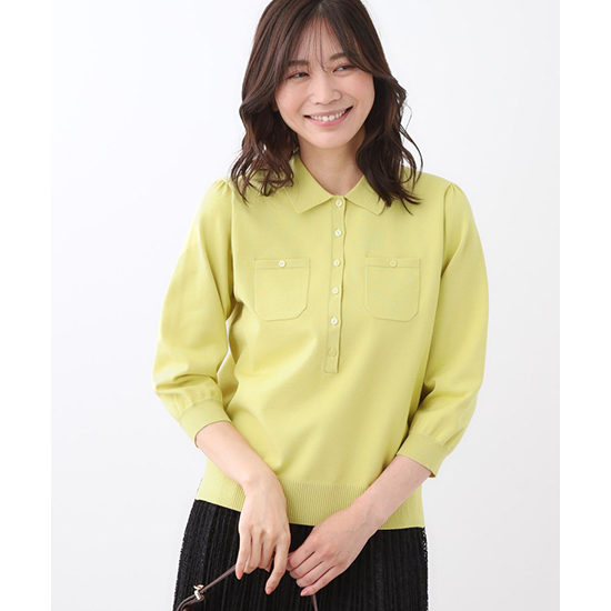 【デザイン】パフ感のある袖が女性らしく、ニットの衿が上品な印象のトレンド感ある衿付きニット。贅沢な細番のストレッチ糸を使用し、細やかな目面でキレイな天竺にポリエステルをプレーティングした編地でおつくりしています。ストレッチ素材で透けにくく、天竺でも安心してお召しいただけます。袖丈は少し短めで残暑の時期にも着ていただける袖丈(七分袖程度)になっています。【素材】目面のキレイな細番手(2/68)の素材です。強撚していますのでピリングにもなりづらいのも特徴です。【仕様】・ポケット数:胸元×2※照明の関係により、実際よりも色味が違って見える場合があります。また、パソコン・スマートフォンなどの環境により、若干製品と画像のカラーが異なる場合もございます。
