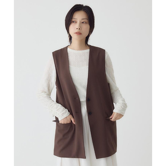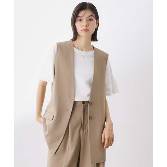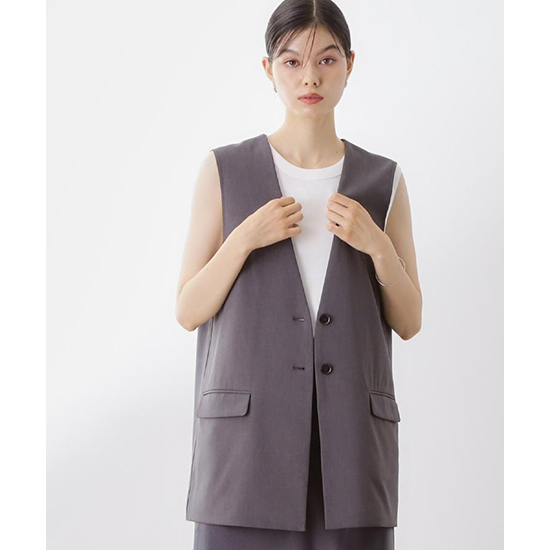 【デザイン】シンプルなジレは、適度な丈感でお腹やヒップ周りをしっかりカバーし、すっきりとしたシルエットを実現します。前面のフラップポケットがアクセントとなり、上品ながらも洗練された印象を与えます。同素材の040-64005(TPUベーシックワイド)/040-64007(TPU2タックワイド)とセットアップでの着こなしもおすすめです。【素材&機能性】さらりとした着心地が魅力の生地を使用し、裏地付きで安心の着用感を実現。サスティナブルな素材を採用しているため、環境にも配慮された1着です。【着こなしポイント】シンプルなデザインは、シャツやブラウスとのインナーとしてはもちろん、単品で羽織るアイテムとしても活躍します。オフィスカジュアルから休日のリラックススタイルまで、幅広いシーンでお洒落に決めることができるジレです。【仕様】・ポケット数:横×2・裏地あり※照明の関係により、実際よりも色味が違って見える場合があります。また、パソコン・スマートフォンなどの環境により、若干製品と画像のカラーが異なる場合もございます。