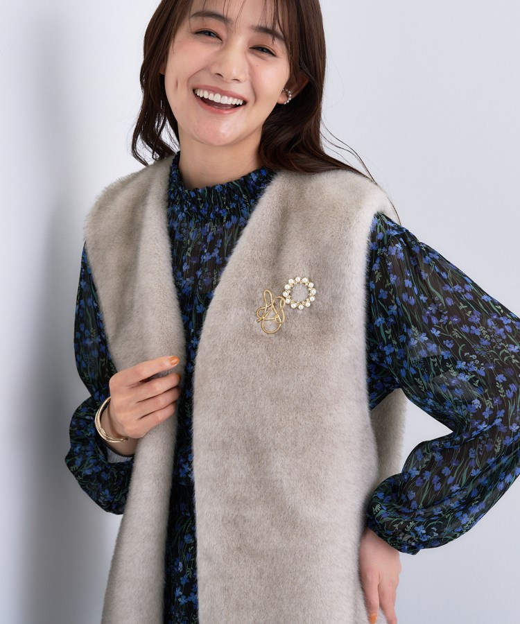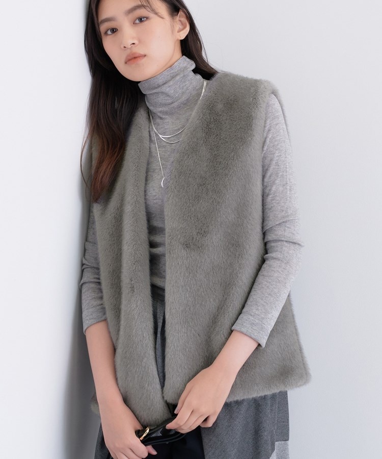 【デザインポイント】トレンドのミンク調の滑らかなタッチのファーが秋らしさをぐっと引き立てるシンプルなジレです。軽い着心地のプラスワンアイテム。裏地側にはポケット付きで機能性も兼ね備えています。インナーがニットになっても窮屈感のない袖繰りや、着ぶくれしにくい絶妙なサイジングにこだわっています。【スタイリングポイント】シアーインナーなどのシンプルトップスや柄ワンピースへのプラスワンで一気に秋のトレンドスタイルが完成します。ボリュームボトムとの相性も良く、ワイドパンツやレザー調のスカート合わせもおすすめです。【素材ポイント】上品な艶感とふわふわした柔らかな肌触りが特徴。ファーの毛先にだけプリントする事で、リアルファーのような表情に仕上げたお手入れしやすいデイリーユースに最適な素材になっております。【仕様】・ポケット数:内側×2・裏地あり※照明の関係により、実際よりも色味が違って見える場合があります。また、パソコン・スマートフォンなどの環境により、若干製品と画像のカラーが異なる場合もございます。