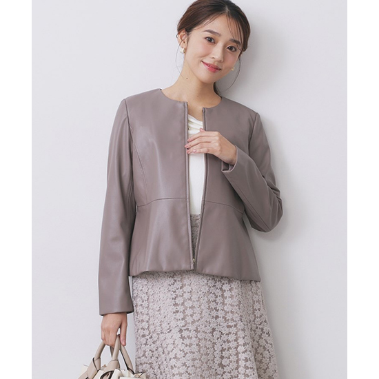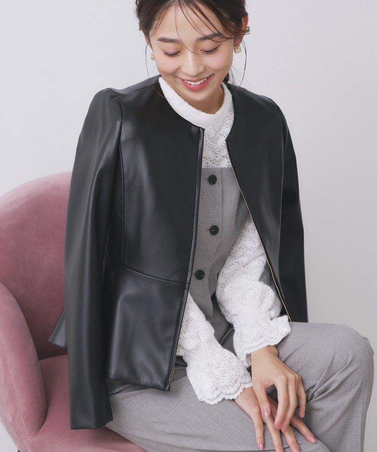 新鮮なペプラムシルエットでストレッチで着心地の良いレザー調ノーカラージャケット【デザイン】・シンプルでミニマルなノーカラーペプラムブルゾン。・身体に程良くフィットする立体的なシルエットで、さりげない広がり過ぎないペプラムシルエットが上品な仕上がりです。・フロントジップの付属をゴールドカラーにすることで上品な高見えが叶います。・サイズ感をコンパクトにし、丈感も腰が少し隠れるくらいの長すぎない着丈なので、ワンピース・スカート・パンツスタイルにもマッチします。【素材】・ラムレザーに近いレザー調を使用。・柔らかでしっとりとした質感で、ストレッチの効いた優しい着心地。・リアルレザーのような質感ながら、取り扱いのしやすさ◎・ハンドウォッシャブルなのでいつでも清潔が保たれます。【仕様】・ポケットなし・裏地あり※照明の関係により、実際よりも色味が違って見える場合があります。また、パソコン・スマートフォンなどの環境により、若干製品と画像のカラーが異なる場合もございます。